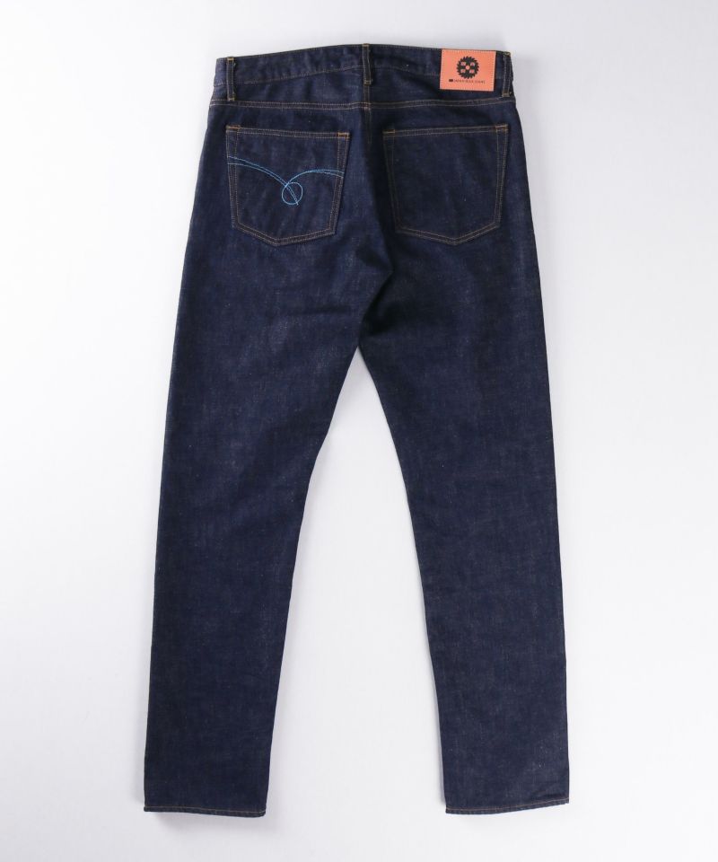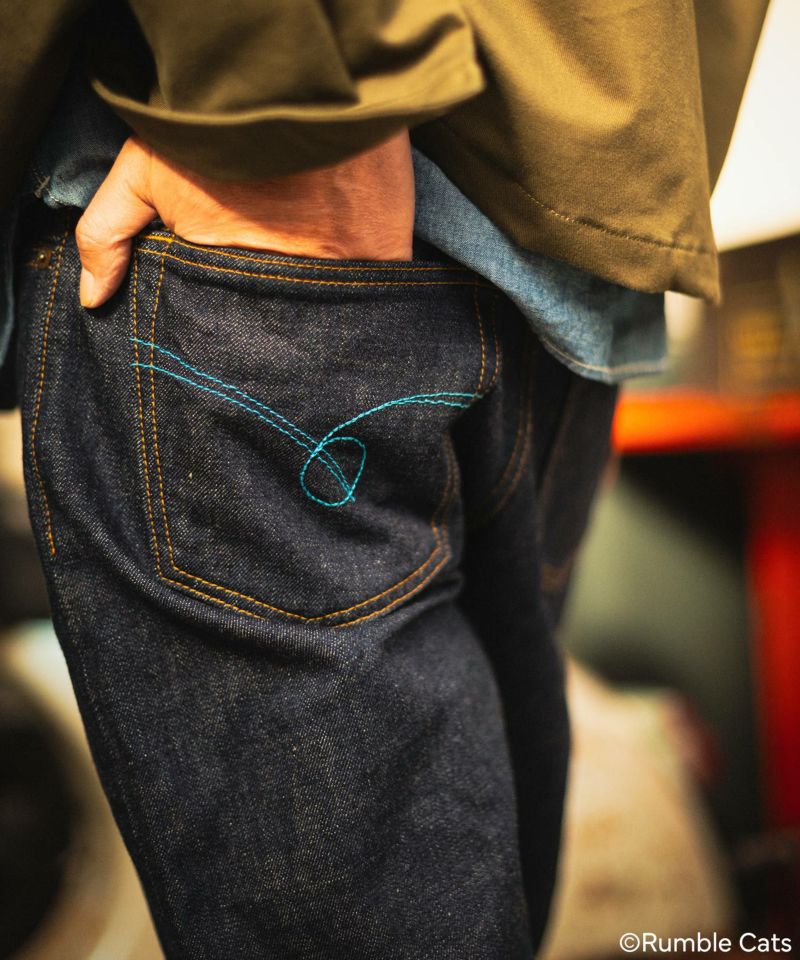 JAPAN BLUE JEANSというブランドネームに合わせて、珍しい青色のセルヴィッチとなっている、今回のコラボオリジナルのデニム生地です。