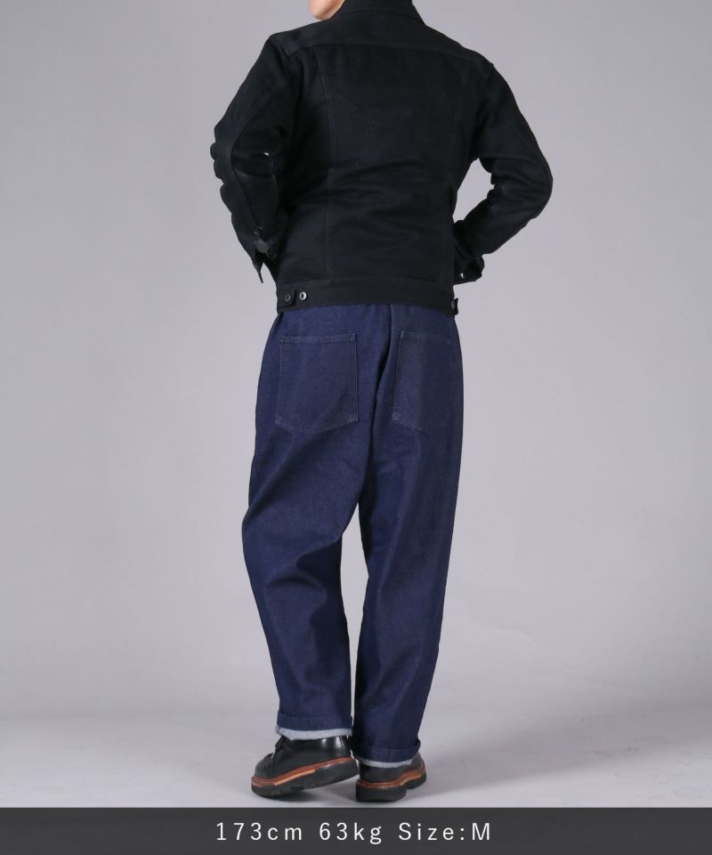 濃紺のデニム生地。着込むほどに色落ちし、経年変化を楽しめます。