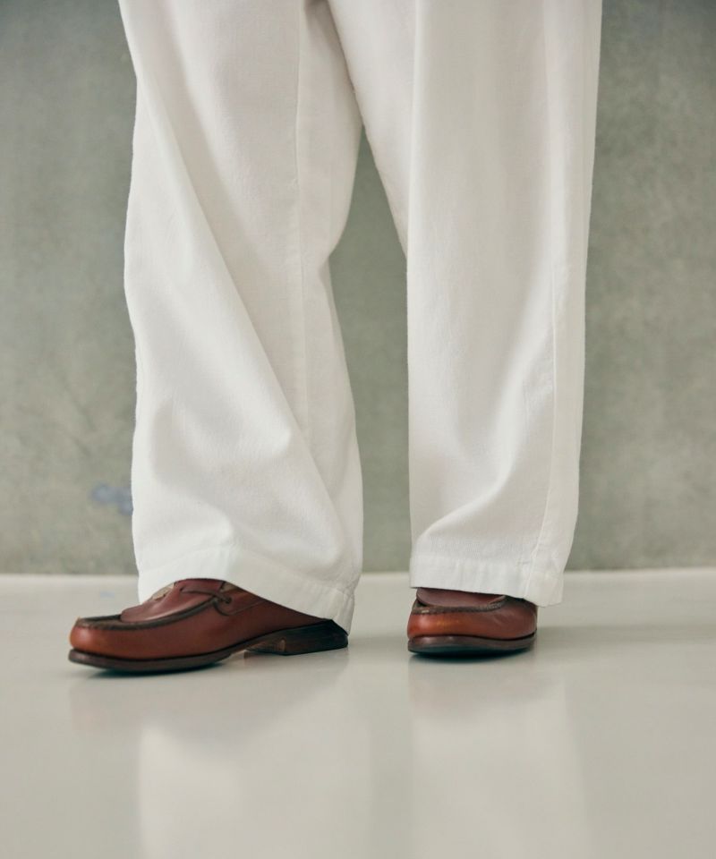 長めのレングスで足元は裾に生地がたまるルーズさが特徴。