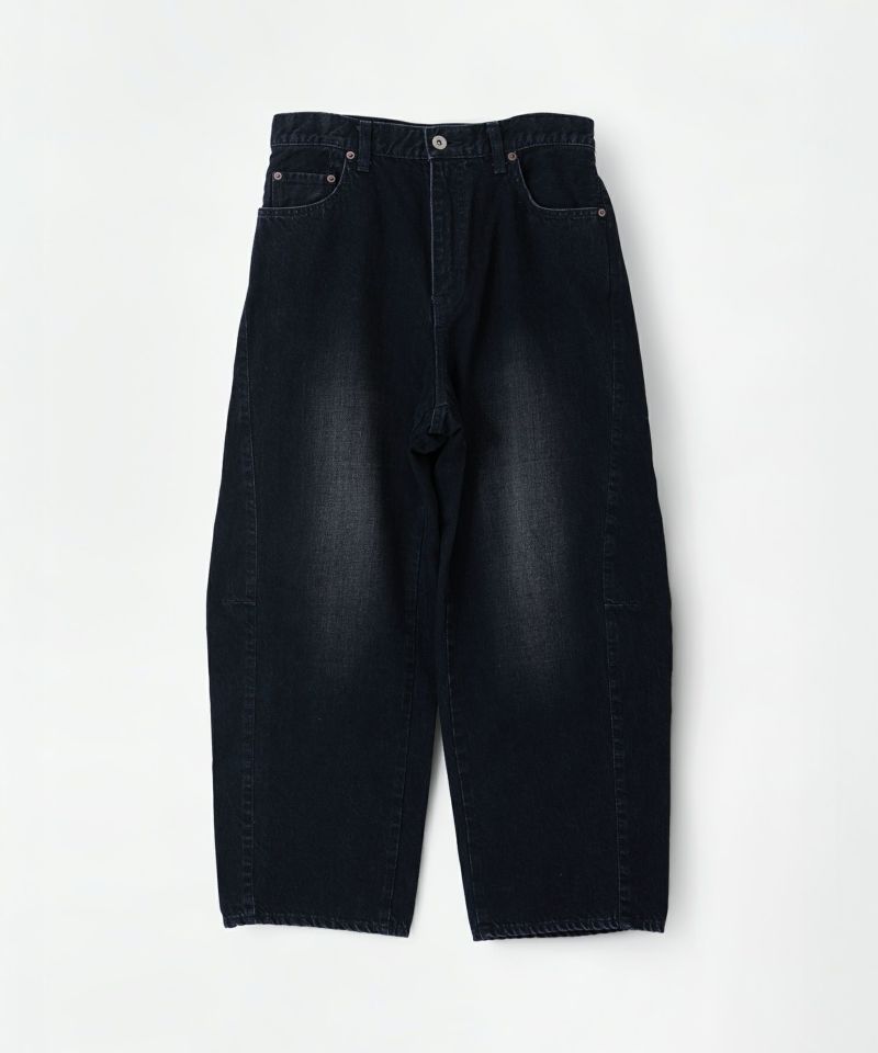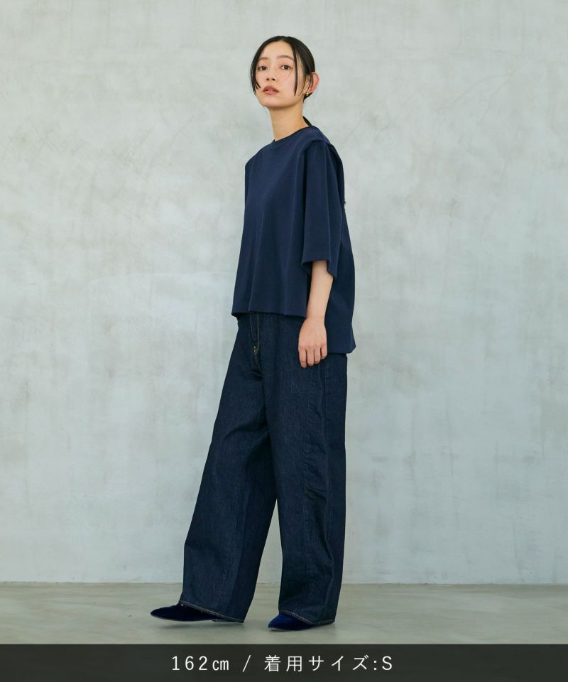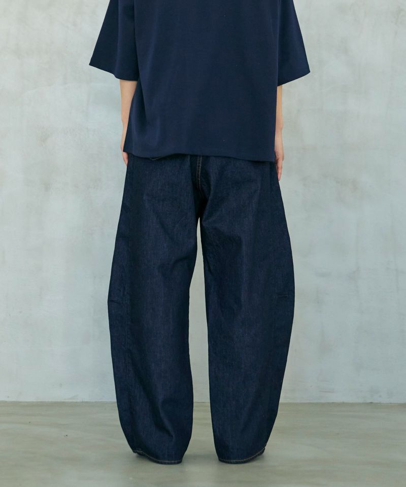 パネルのように縫製された立体的なシルエットのワイドジーンズ。