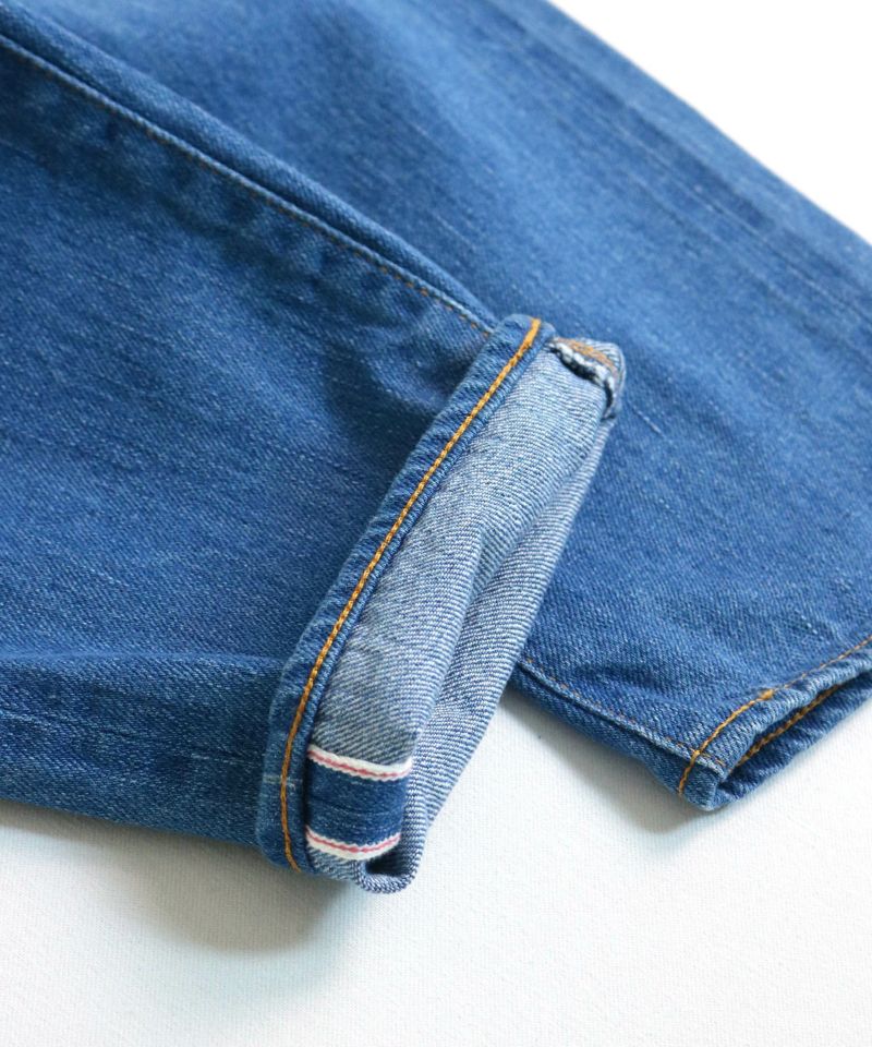 ヴィンテージウォッシュ加工を施した、鮮やかなブルーが映えるジーンズです。