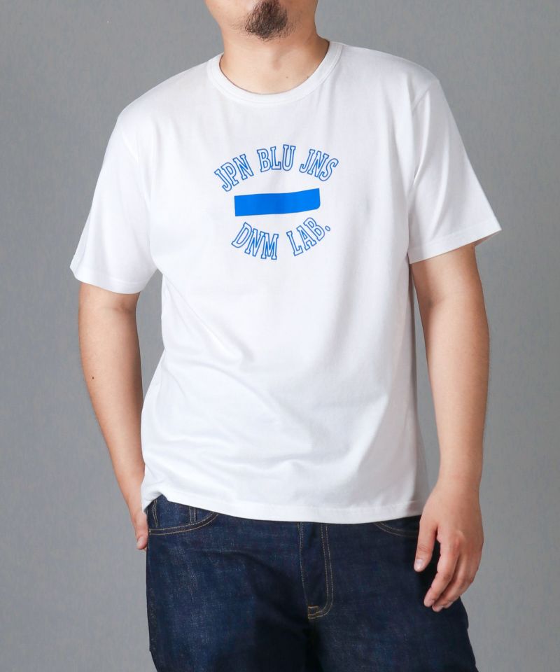 JAPAN BLUE JEANSのブランドネームをプリントしたカレッジTシャツ。