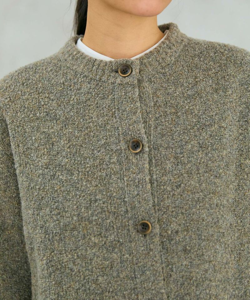 目の粗いブークレニットで、素材の凸凹感やメランジの表情を楽しめるニット。