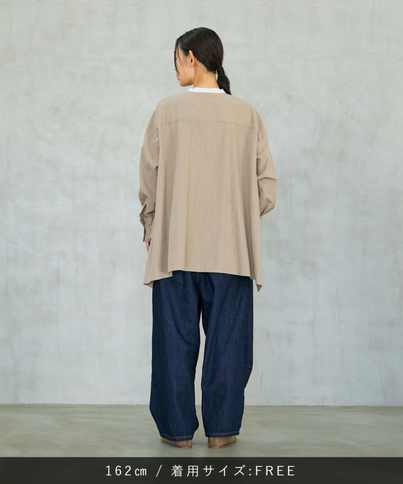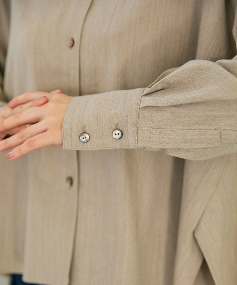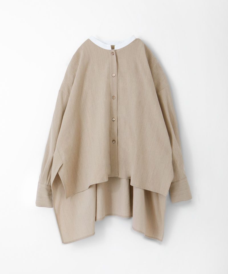首元のクレリックデザインが印象的なバンドカラーシャツ。