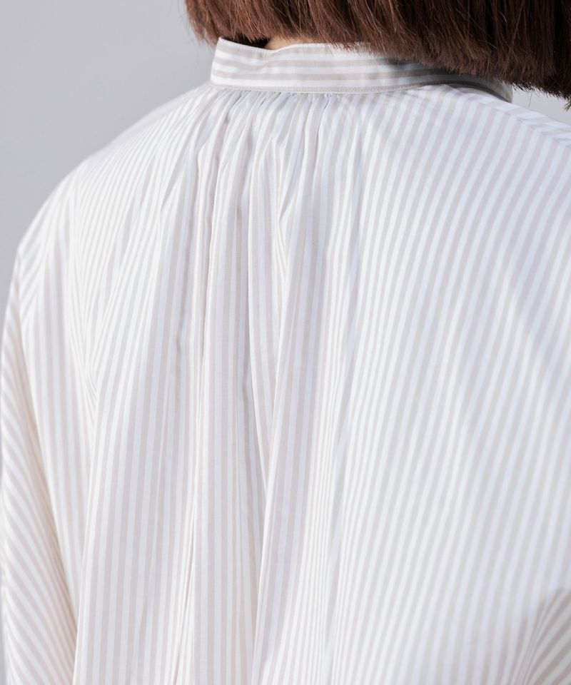 細めのストライプが大人っぽく、淡いトーンで爽やかな印象に。