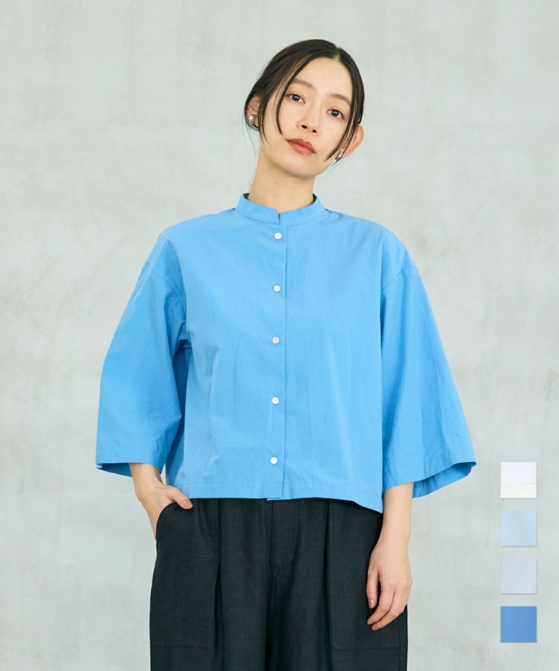 首もとはバンドカラーで、顔まわりがすっきり見えるのも嬉しいポイント。