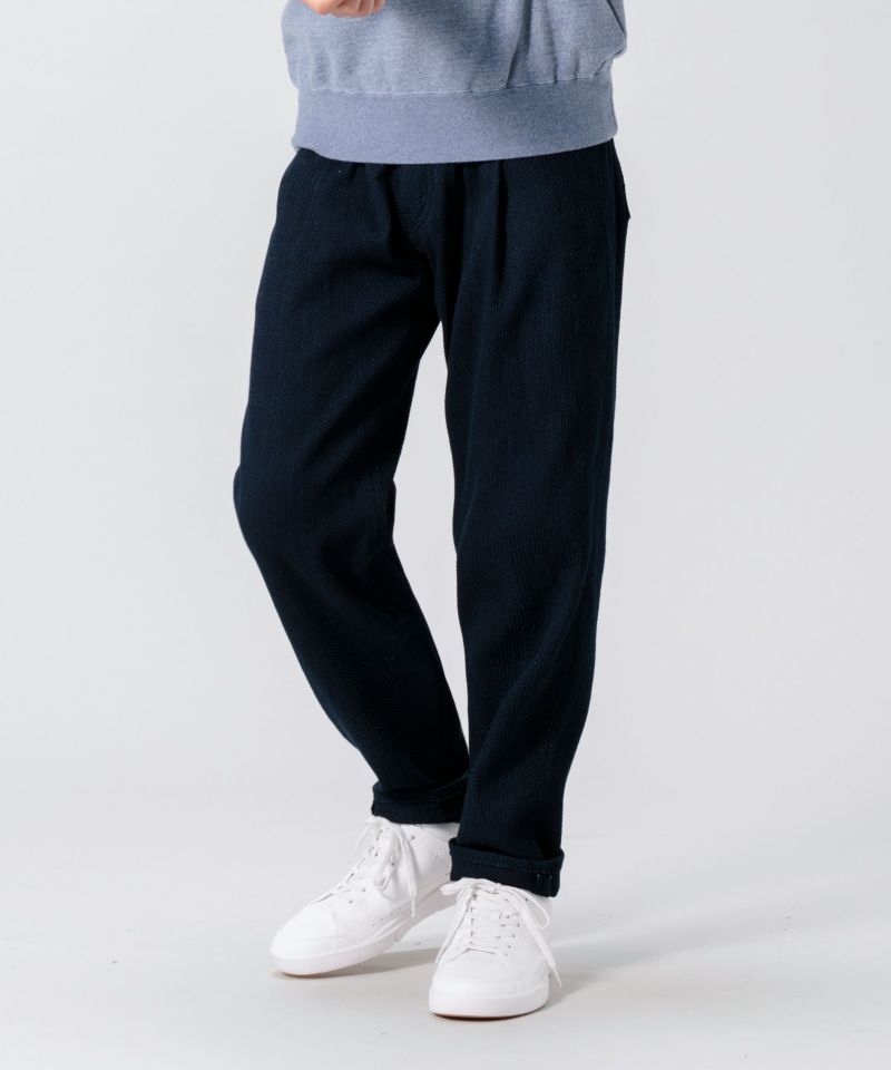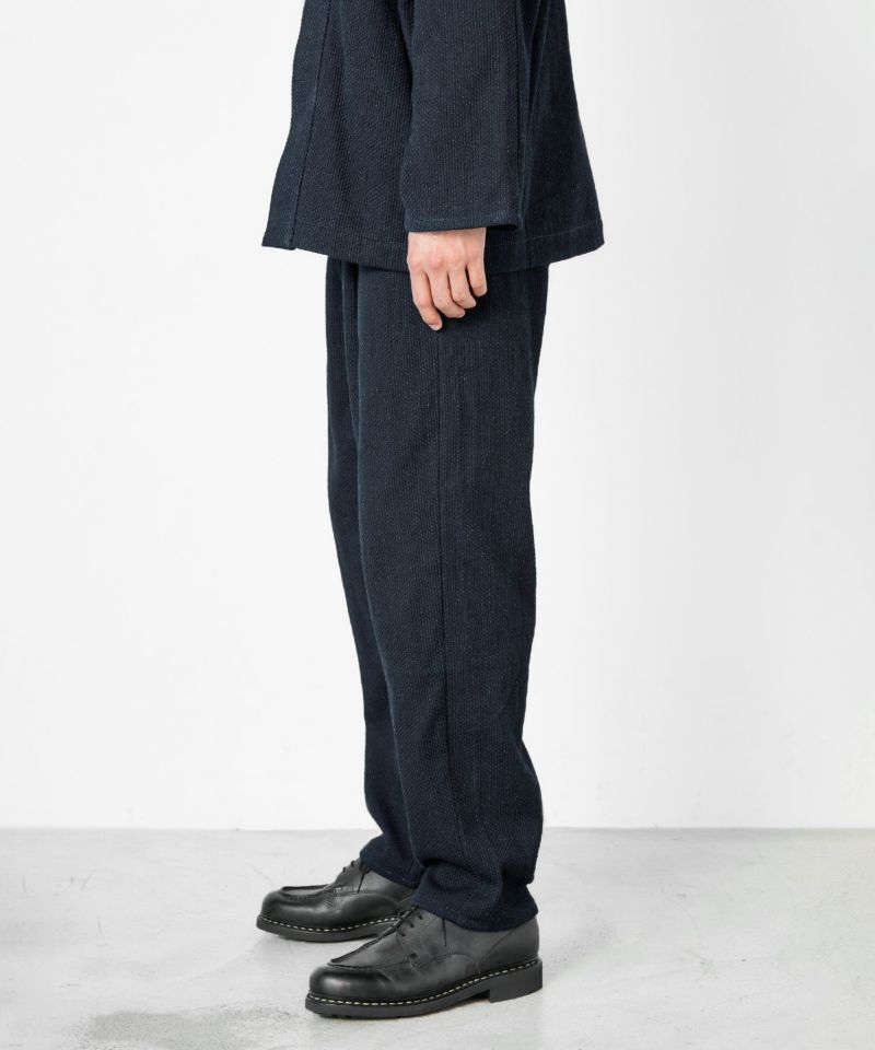股上とお尻周りにゆとりを持たせていますが、裾に向かって絞りをかけることで、すっきりとした印象に仕上げています。