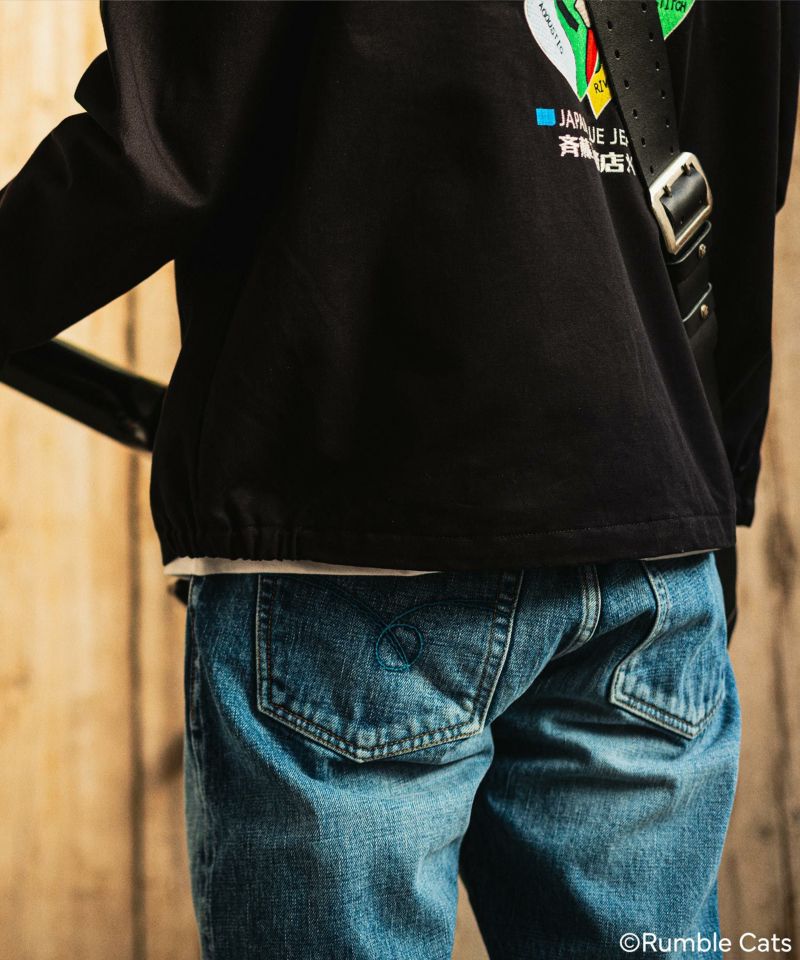 斉藤謹製オリジナルデザインの革パッチに加え、ポケットの布には斉藤和義氏手書きのジャパンブルージーンズをイメージしたイラストをプリントし、