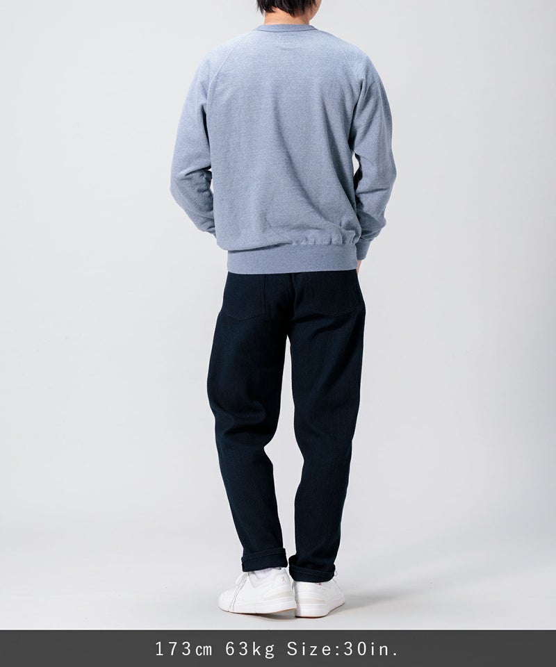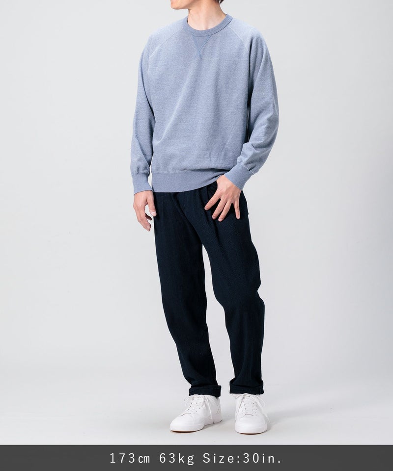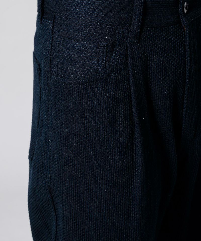 通常のデニム生地と同じロープ染色のインディゴカラーで染められた糸を使用しているため、経年変化もお楽しみいただけます。