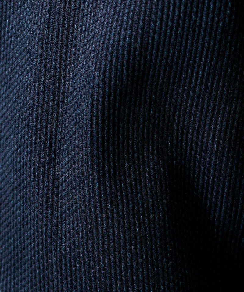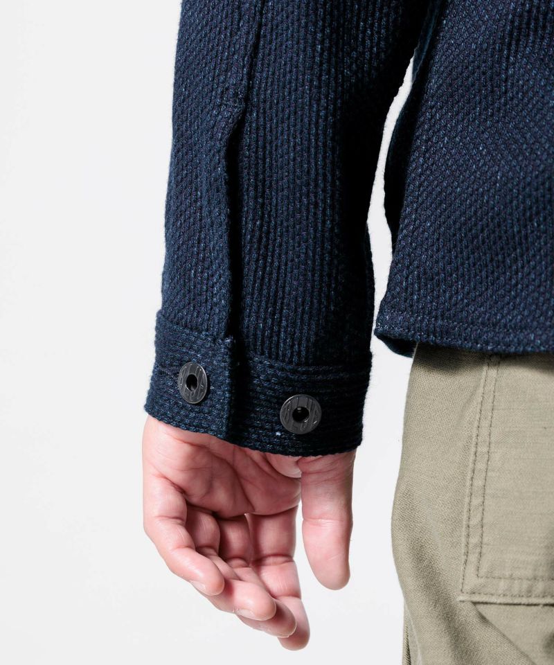 通常のデニム生地と同じロープ染色のインディゴカラーで染められた糸を使用しているため、経年変化もお楽しみいただけます。