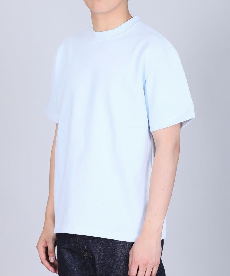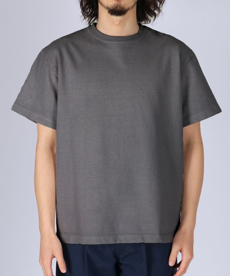 生地は空気精紡により、適度な空気を含んだしっかりとした風合いの糸を度詰めのインレイ編みにしています。通常の編み方にもう1本糸を入れることで、ハードな生地感を実現。