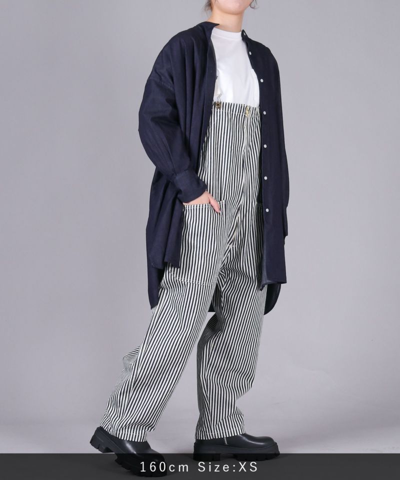 白と紺のストライプ柄。ワークウェア由来の生地で、カジュアルながらも汚れが目立ちにくいのが特徴です。