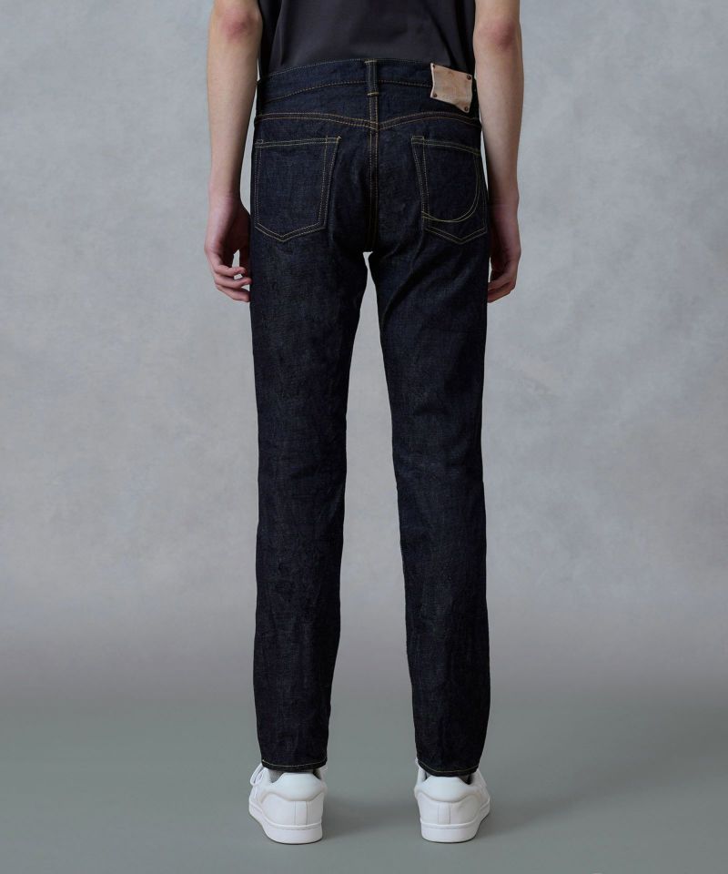 ロープ染色を繰り返し特濃インディゴブルーに染めたジンバブエコットン/6.5番手糸を旧式力織機でゆっくりと織り上げた14.7オンスデニム生地は、力強さのある表情を持ち、濃淡のコントラストのある経年変化と自然なタテ落ちを楽しめます。