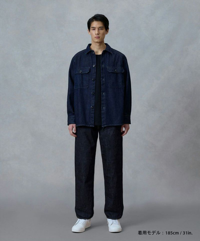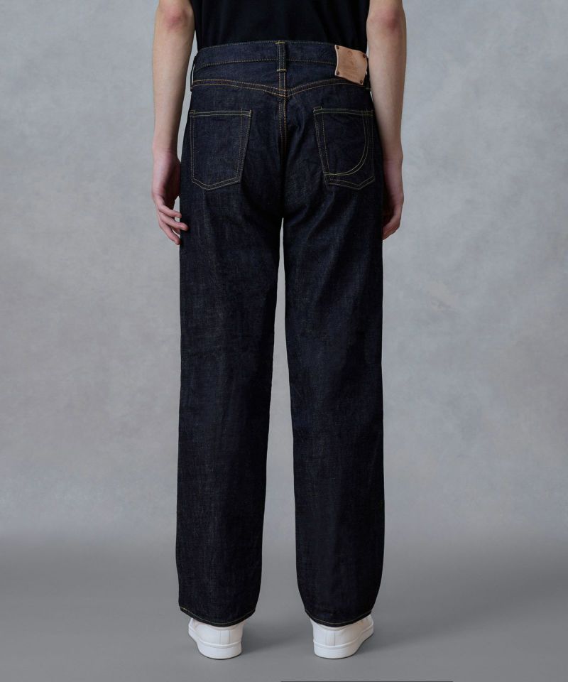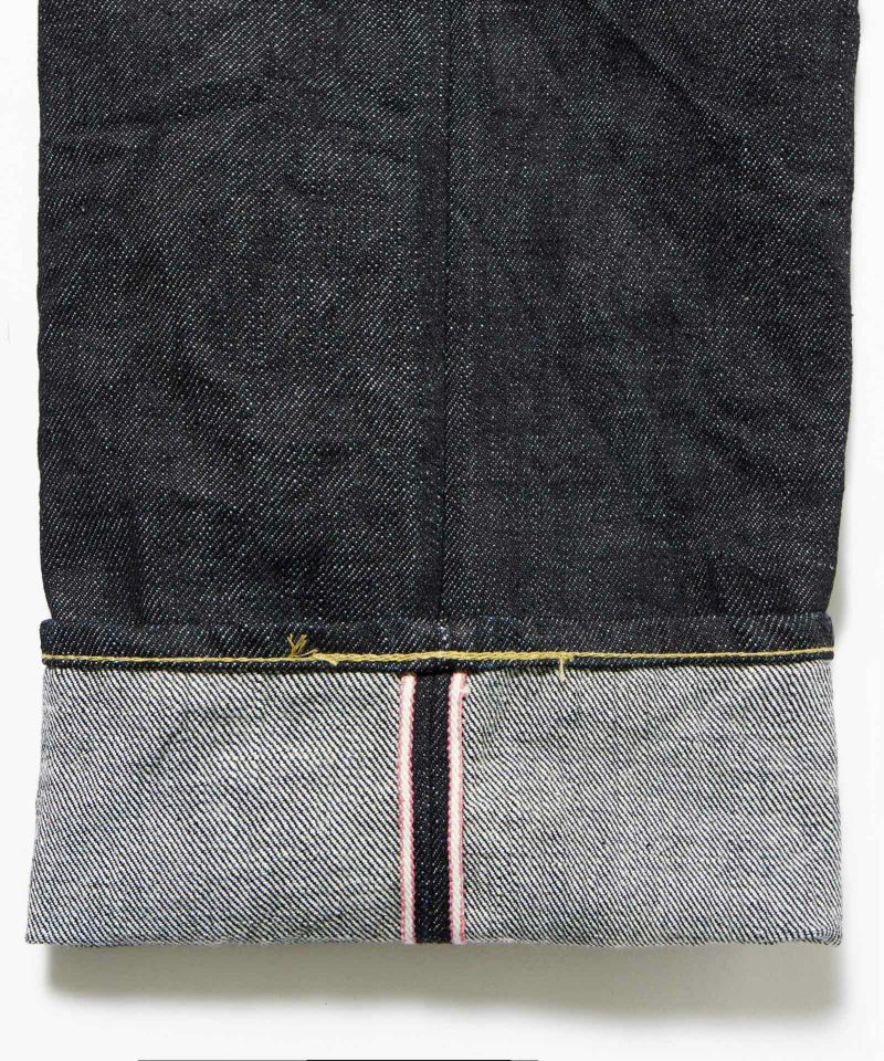ロープ染色を繰り返し特濃インディゴブルーに染めたジンバブエコットン/6.5番手糸を旧式力織機でゆっくりと織り上げた14.7オンスデニム生地は、力強さのある表情を持ち、濃淡のコントラストのある経年変化と自然なタテ落ちを楽しめます。