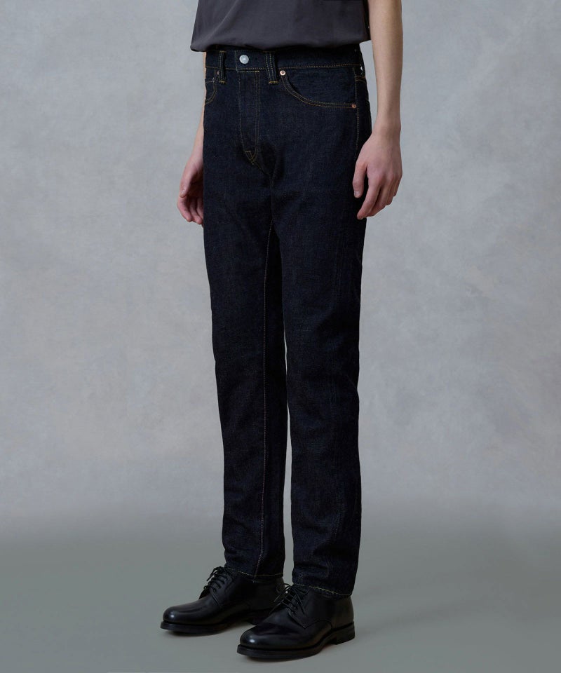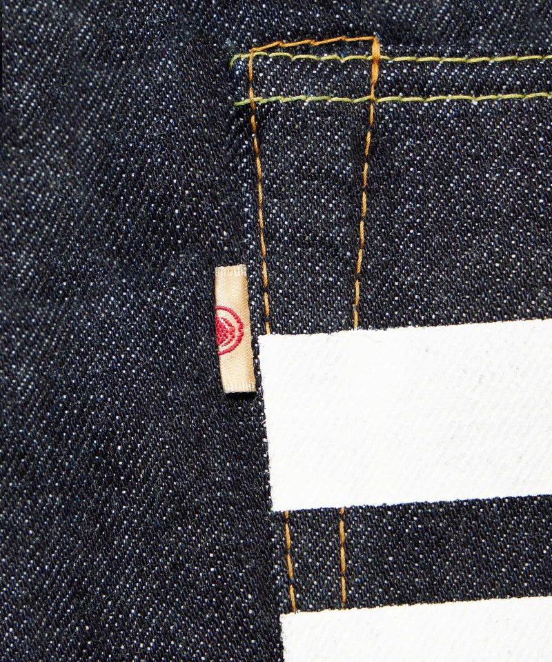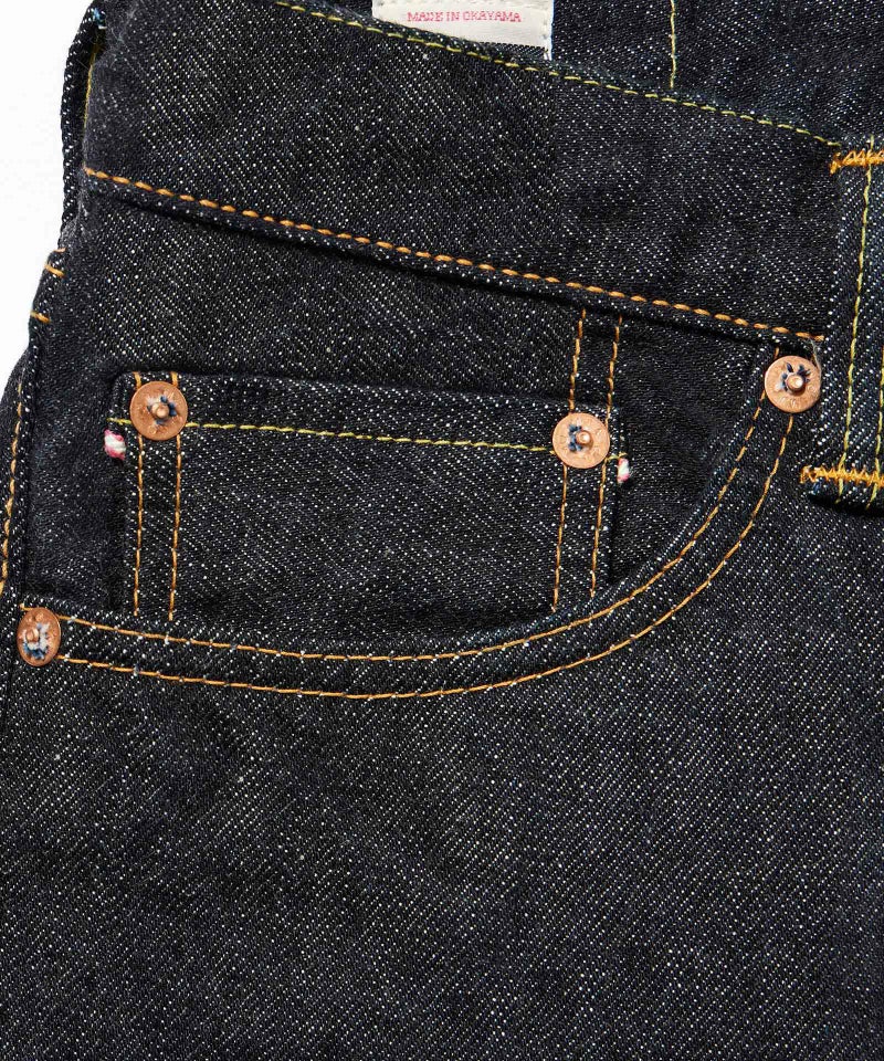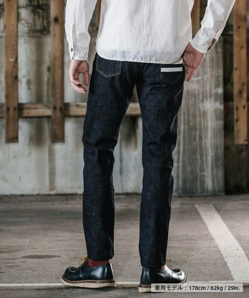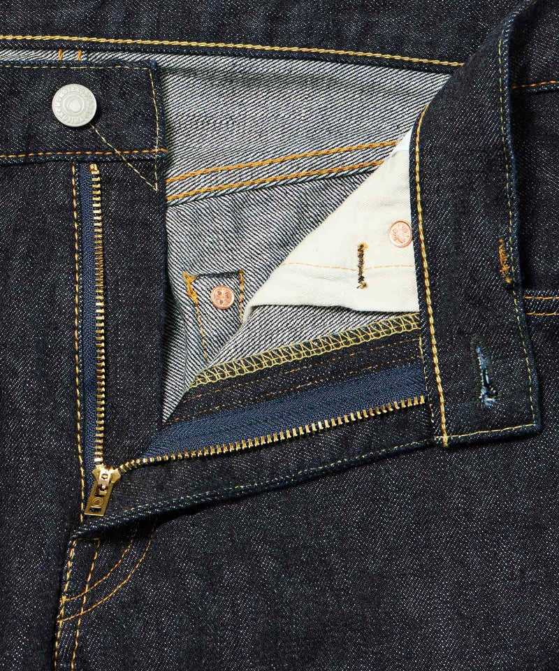 ロープ染色を繰り返し特濃インディゴブルーに染めたジンバブエコットン/6番手糸を旧式力織機でゆっくりと織り上げた15.7オンスデニム生地は、力強さのある表情を持ち、濃淡のコントラストのある経年変化と自然なタテ落ちを楽しめます。