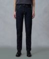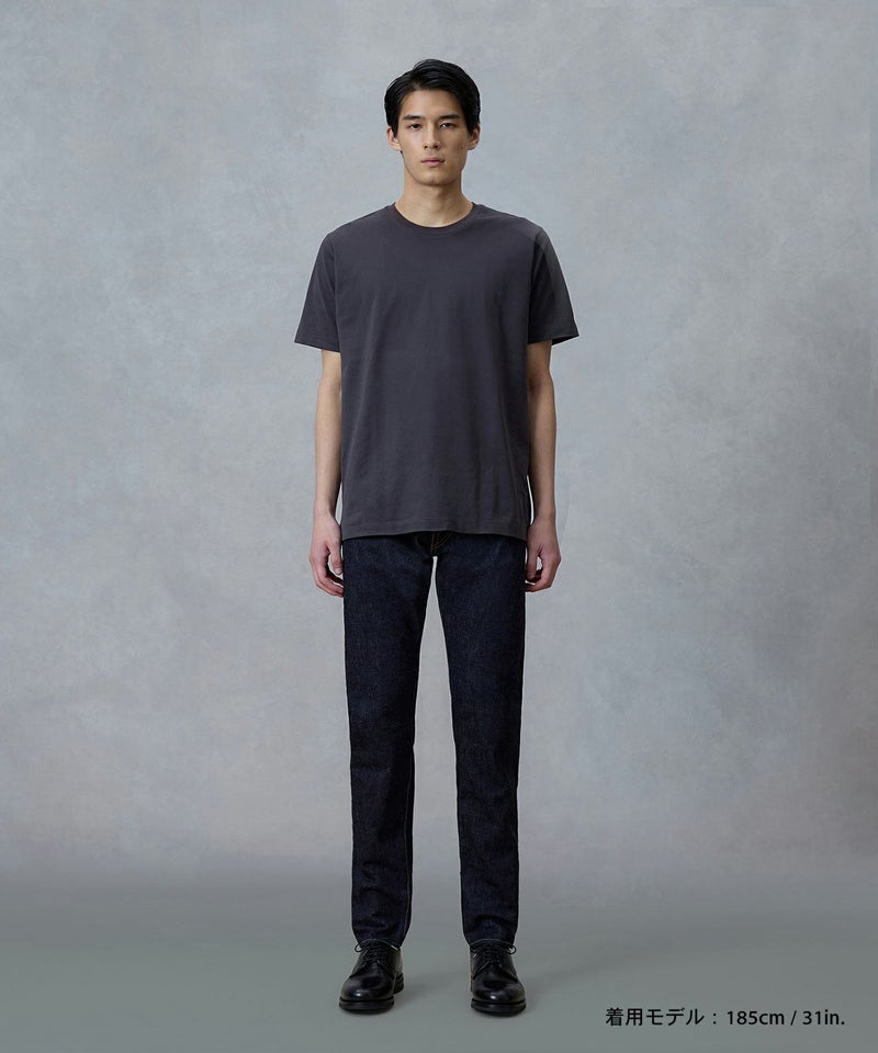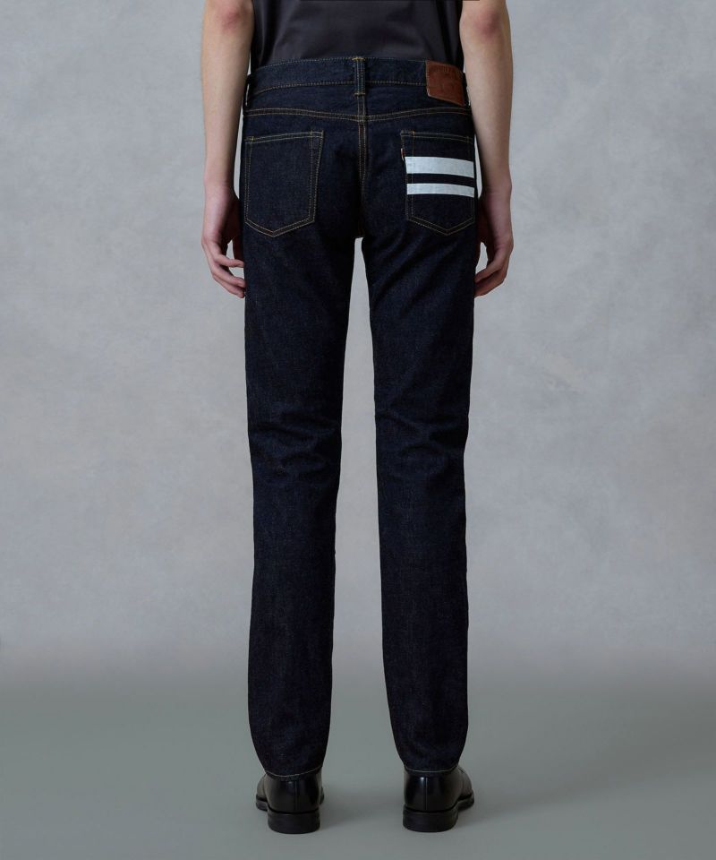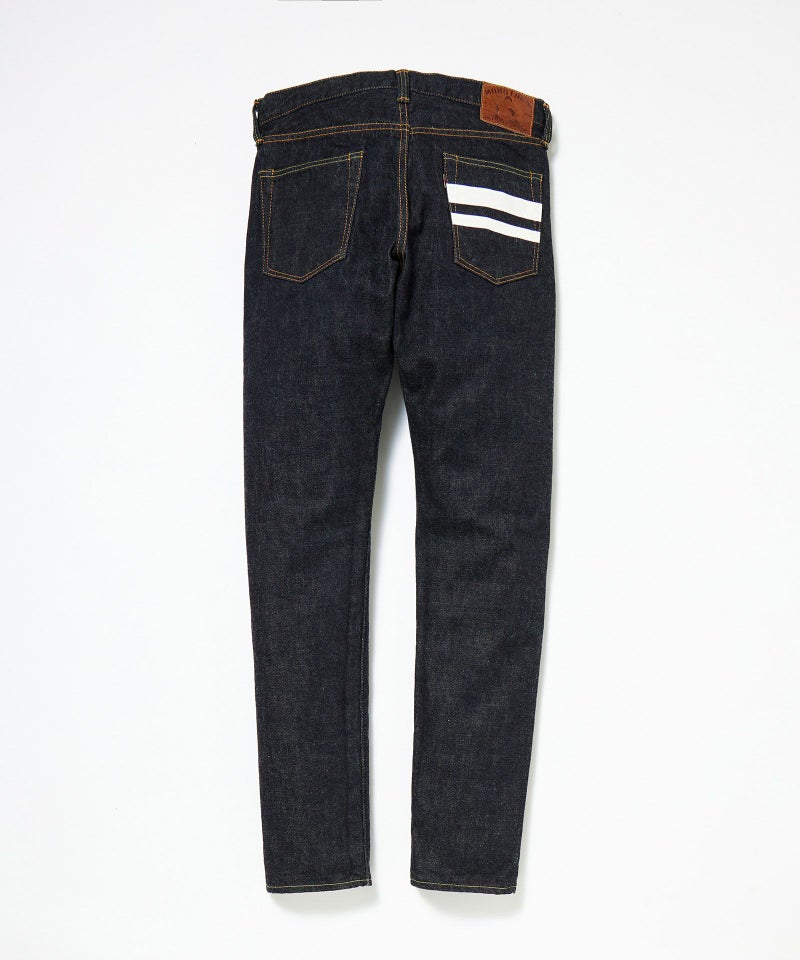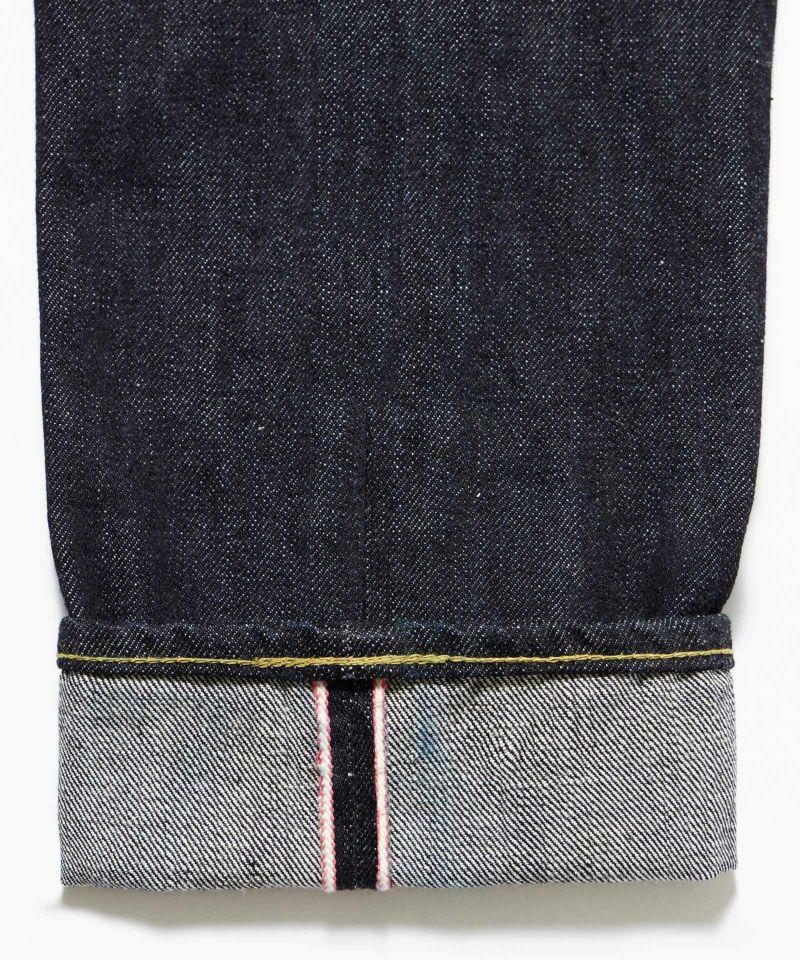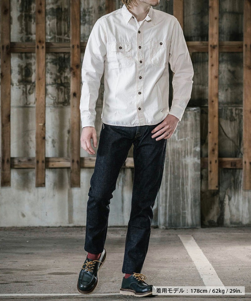 ロープ染色を繰り返し特濃インディゴブルーに染めたジンバブエコットン/6番手糸を旧式力織機でゆっくりと織り上げた15.7オンスデニム生地は、力強さのある表情を持ち、濃淡のコントラストのある経年変化と自然なタテ落ちを楽しめます。