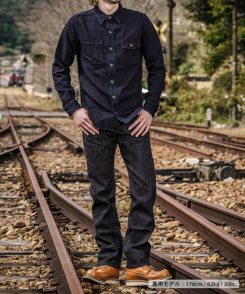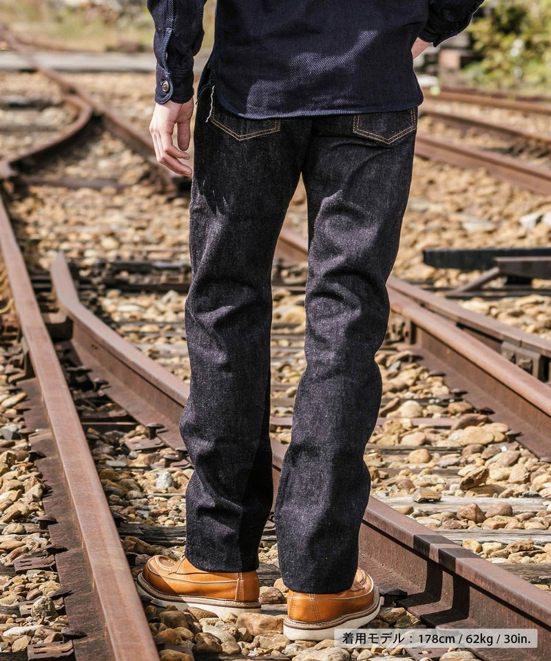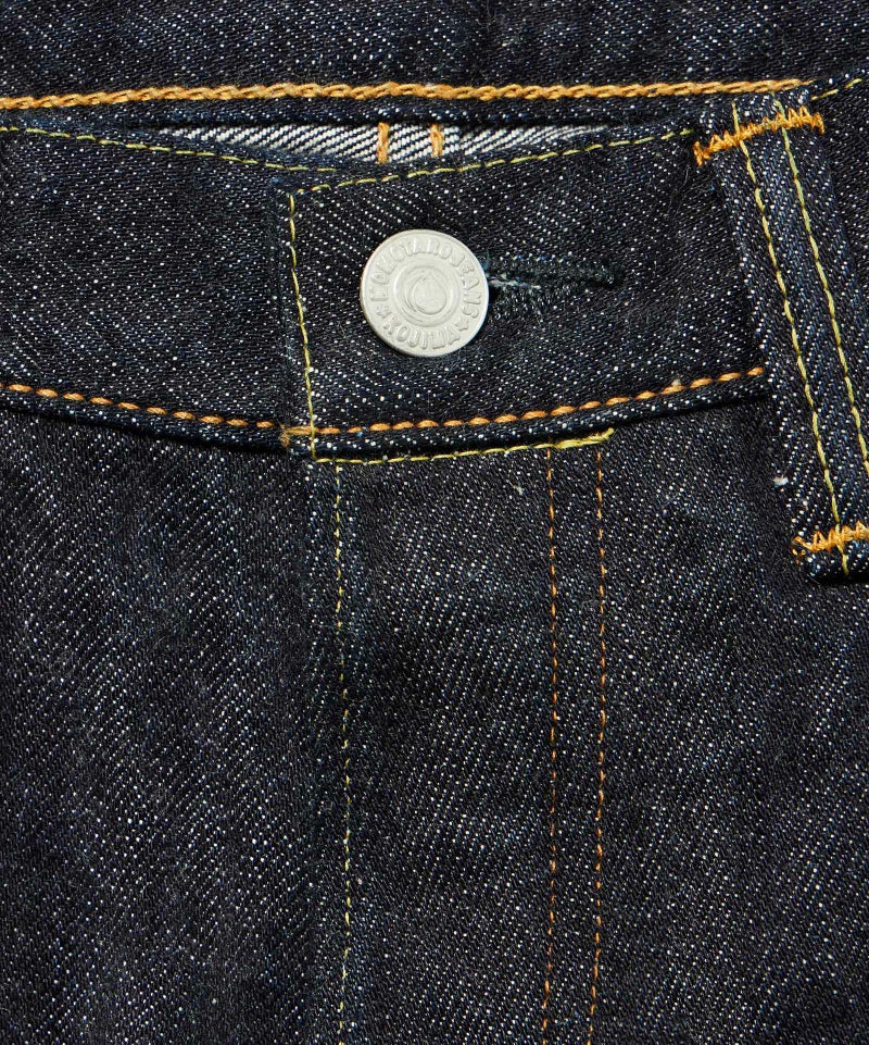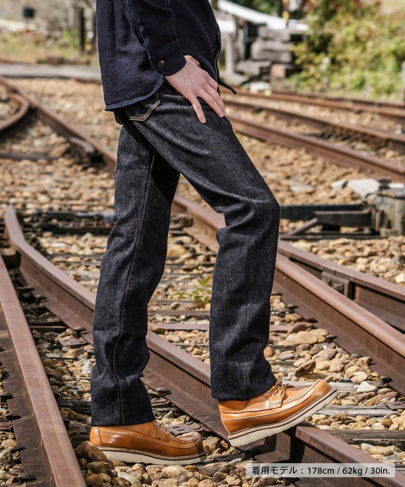 ロープ染色を繰り返し特濃インディゴブルーに染めたジンバブエコットン/6番手糸を旧式力織機でゆっくりと織り上げた15.7オンスデニム生地は、力強さのある表情を持ち、濃淡のコントラストのある経年変化と自然なタテ落ちを楽しめます。防縮加工・捻じれ防止加工・生地表面の弱毛焼き加工は行っていません。