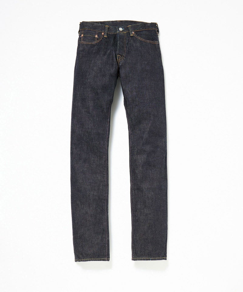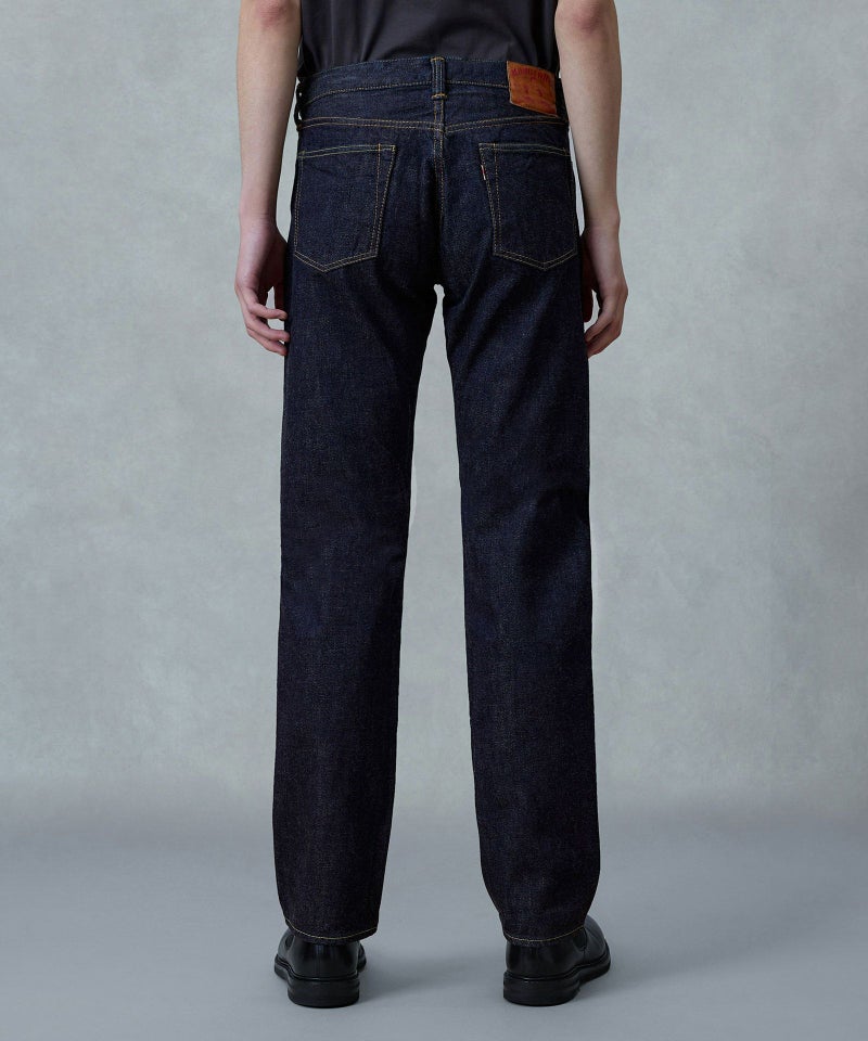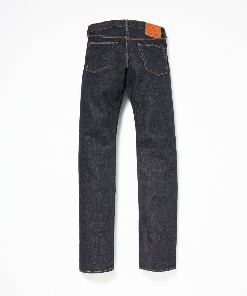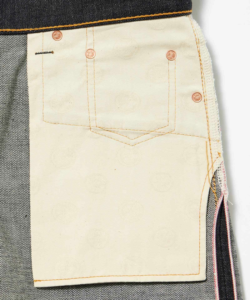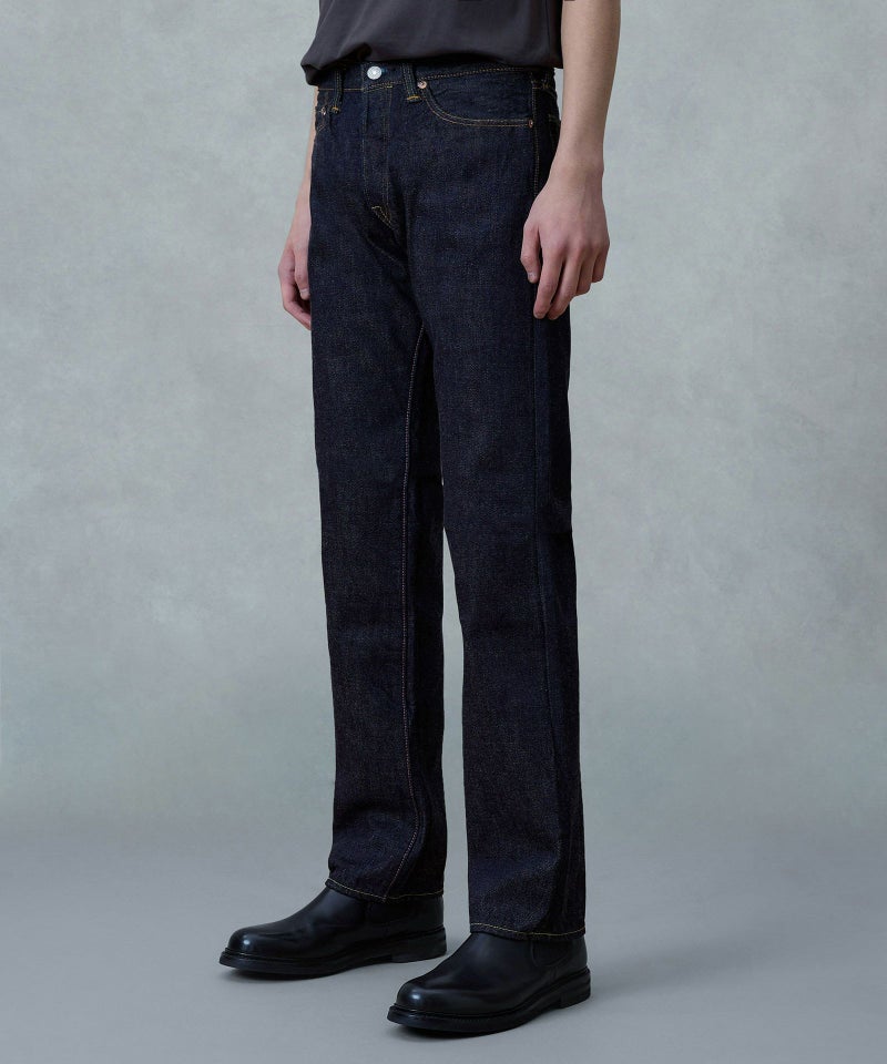 ロープ染色を繰り返し特濃インディゴブルーに染めたジンバブエコットン/6番手糸を旧式力織機でゆっくりと織り上げた15.7オンスデニム生地は、力強さのある表情を持ち、濃淡のコントラストのある経年変化と自然なタテ落ちを楽しめます。防縮加工・捻じれ防止加工・生地表面の弱毛焼き加工は行っていません。