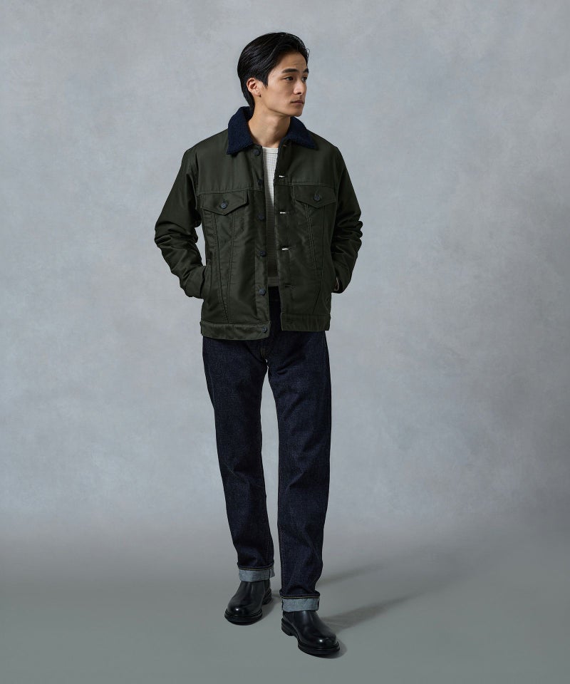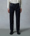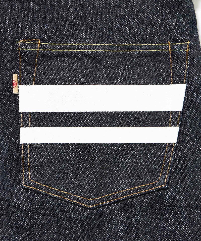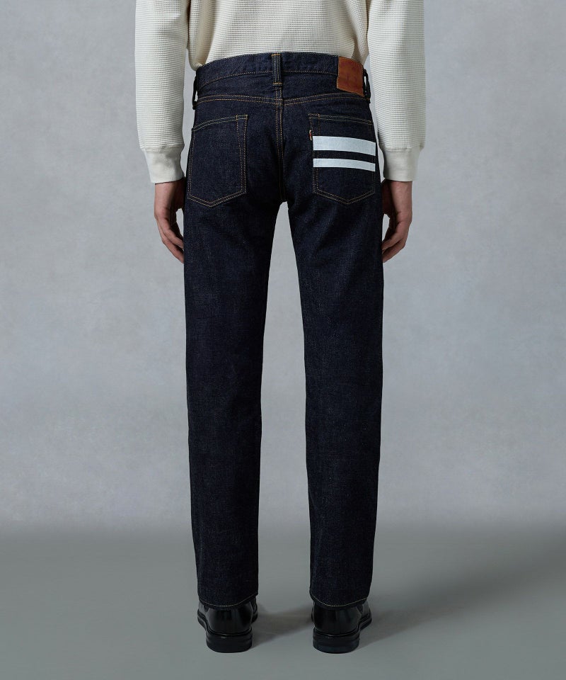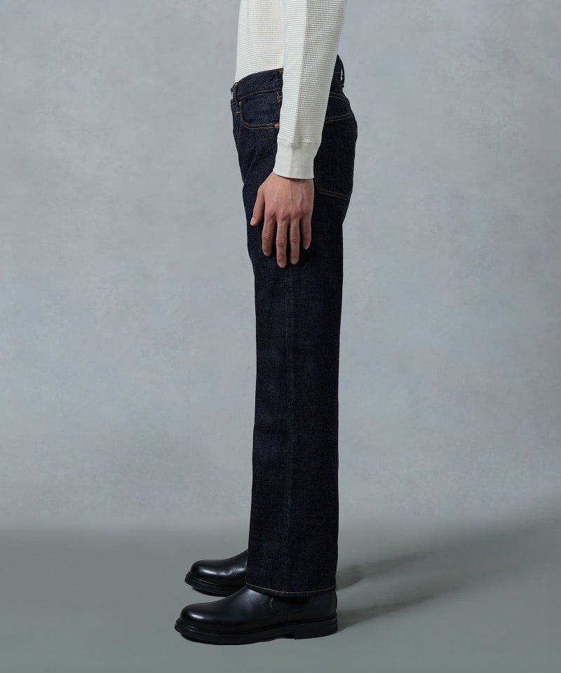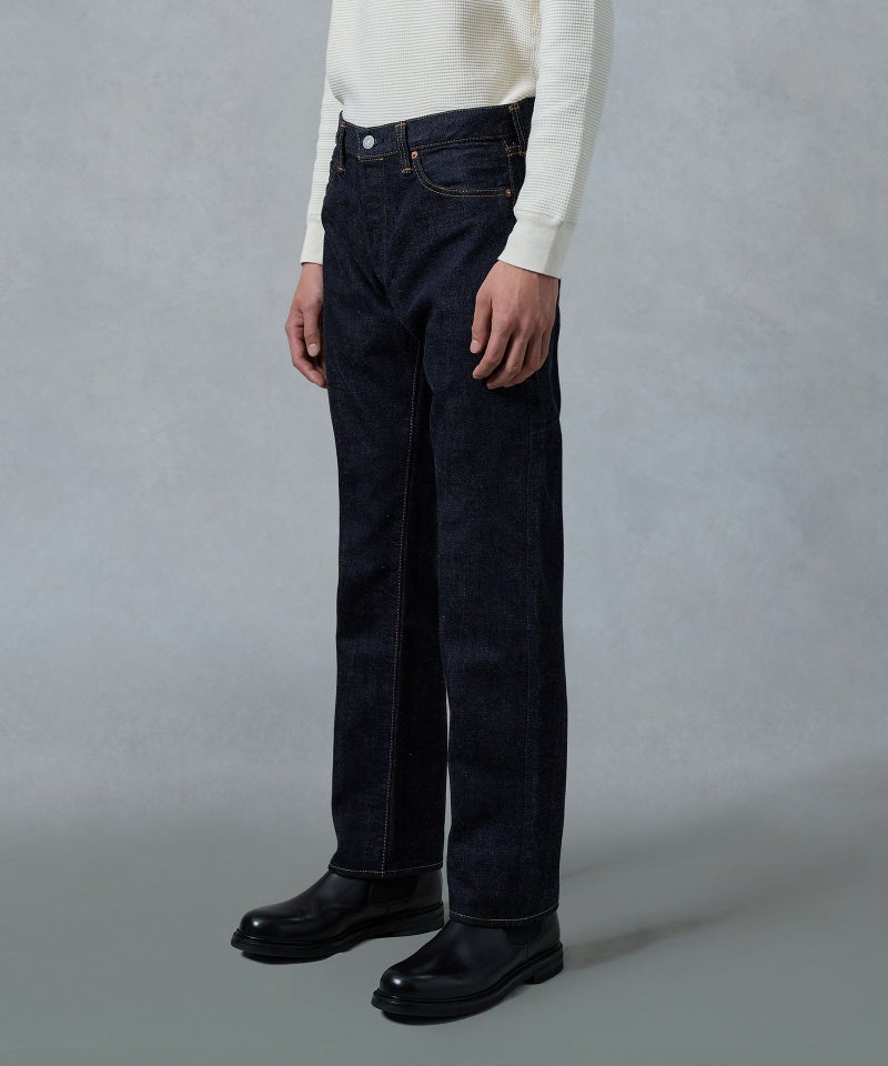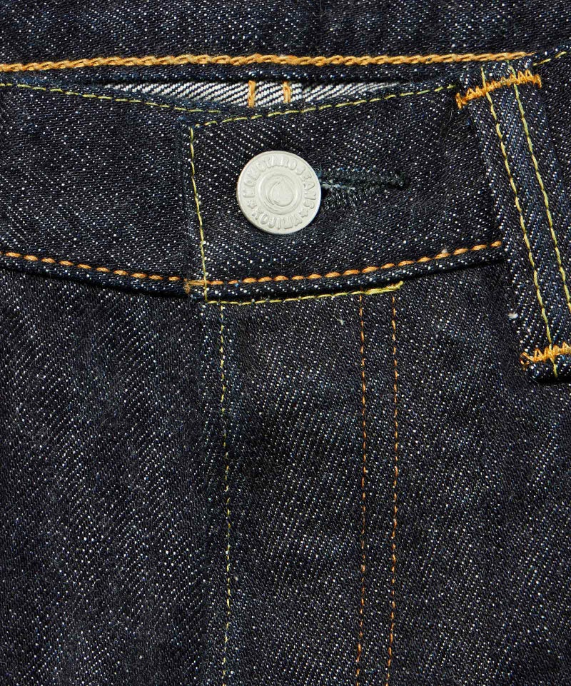 ロープ染色を繰り返し特濃インディゴブルーに染めたジンバブエコットン/6番手糸を旧式力織機でゆっくりと織り上げた15.7オンスデニム生地は、力強さのある表情を持ち、濃淡のコントラストのある経年変化と自然なタテ落ちを楽しめます。