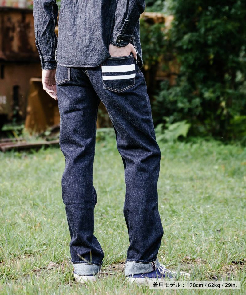 ロープ染色を繰り返し特濃インディゴブルーに染めたジンバブエコットン/6番手糸を旧式力織機でゆっくりと織り上げた15.7オンスデニム生地は、力強さのある表情を持ち、濃淡のコントラストのある経年変化と自然なタテ落ちを楽しめます。
