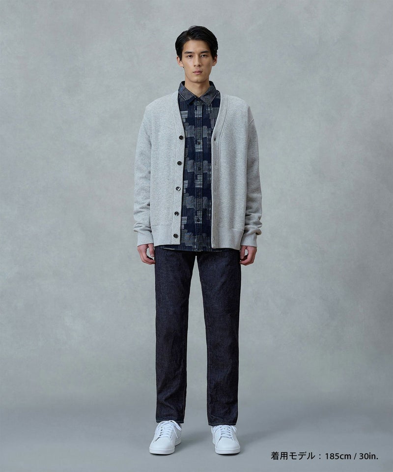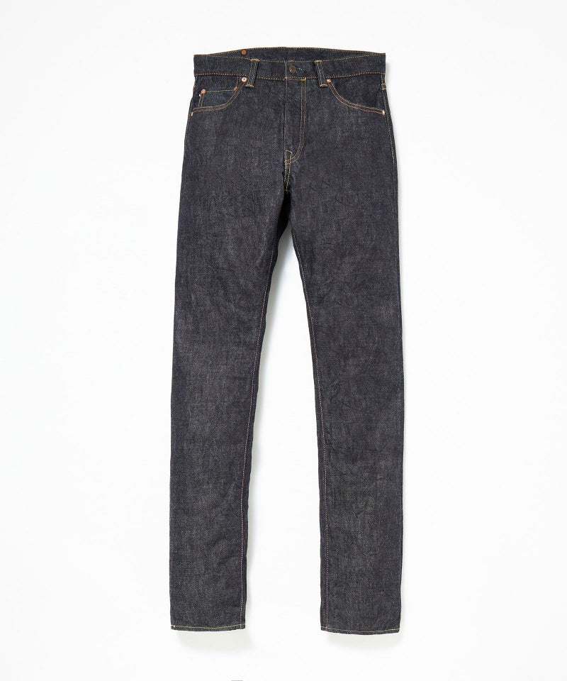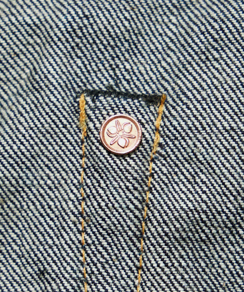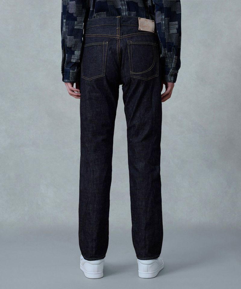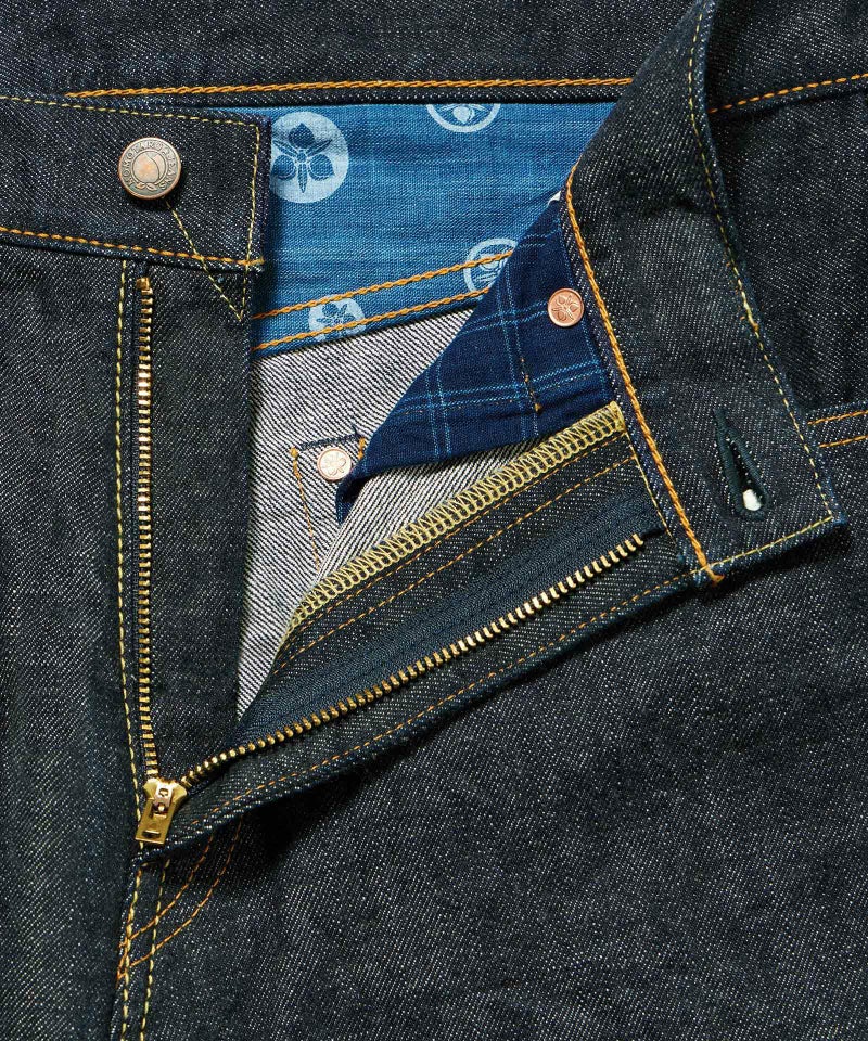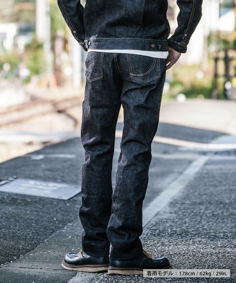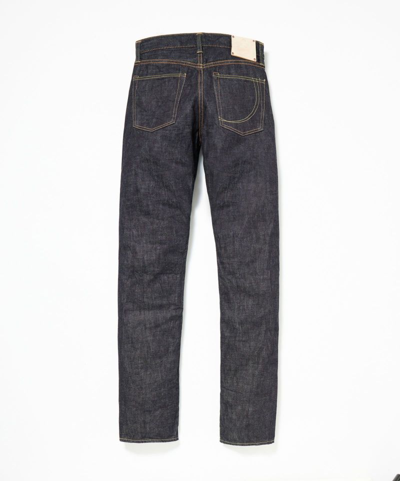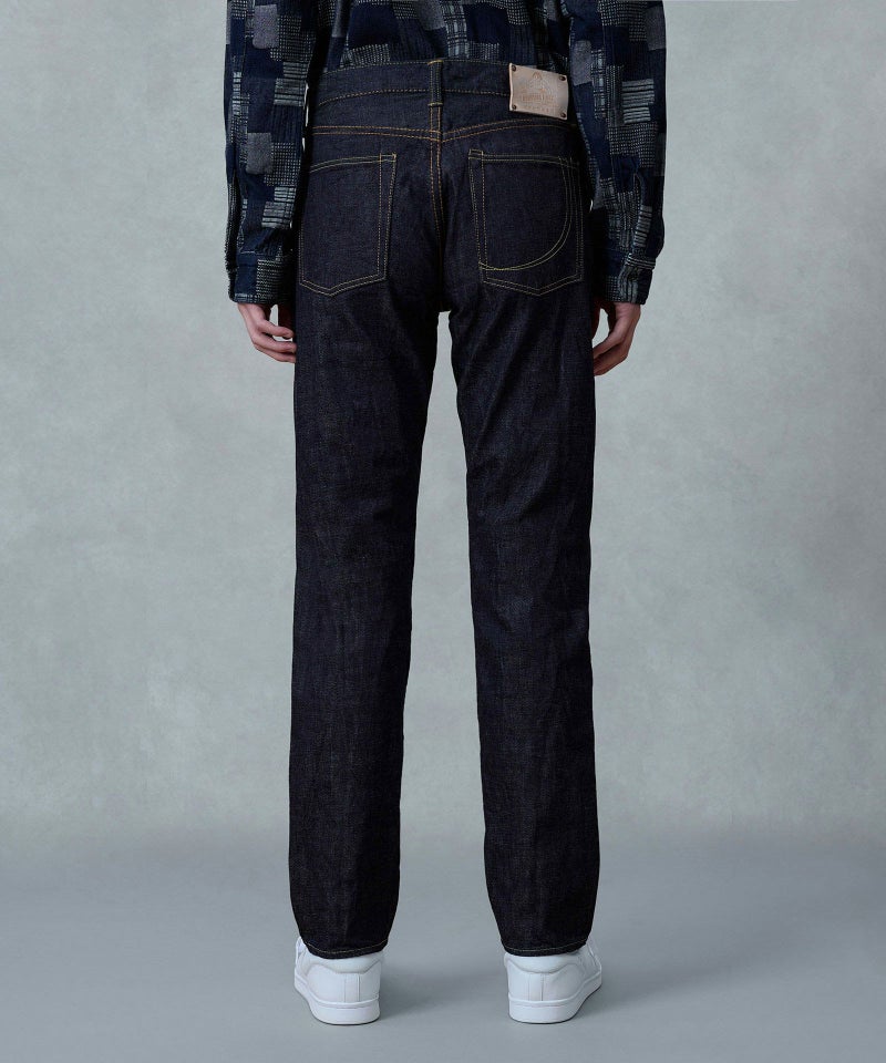 ロープ染色を繰り返し特濃インディゴブルーに染めたジンバブエコットン/6.5番手糸を旧式力織機でゆっくりと織り上げた14.7オンスデニム生地は、力強さのある表情を持ち、濃淡のコントラストのある経年変化と自然なタテ落ちを楽しめます。