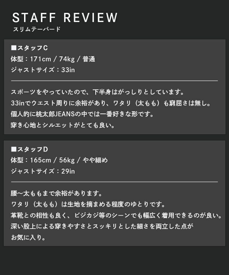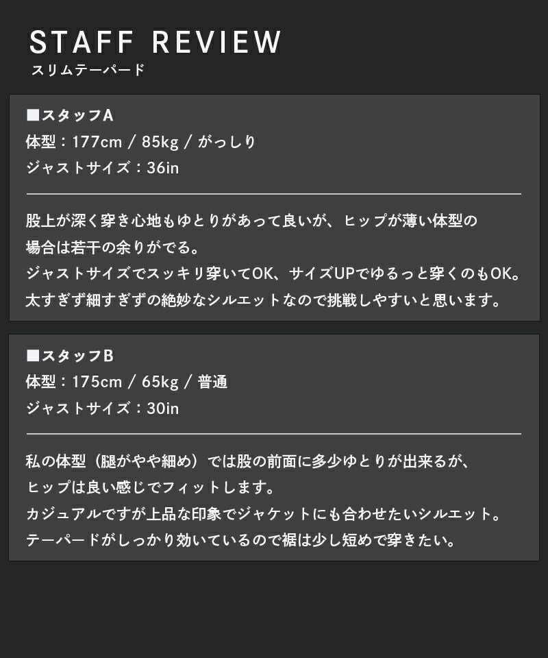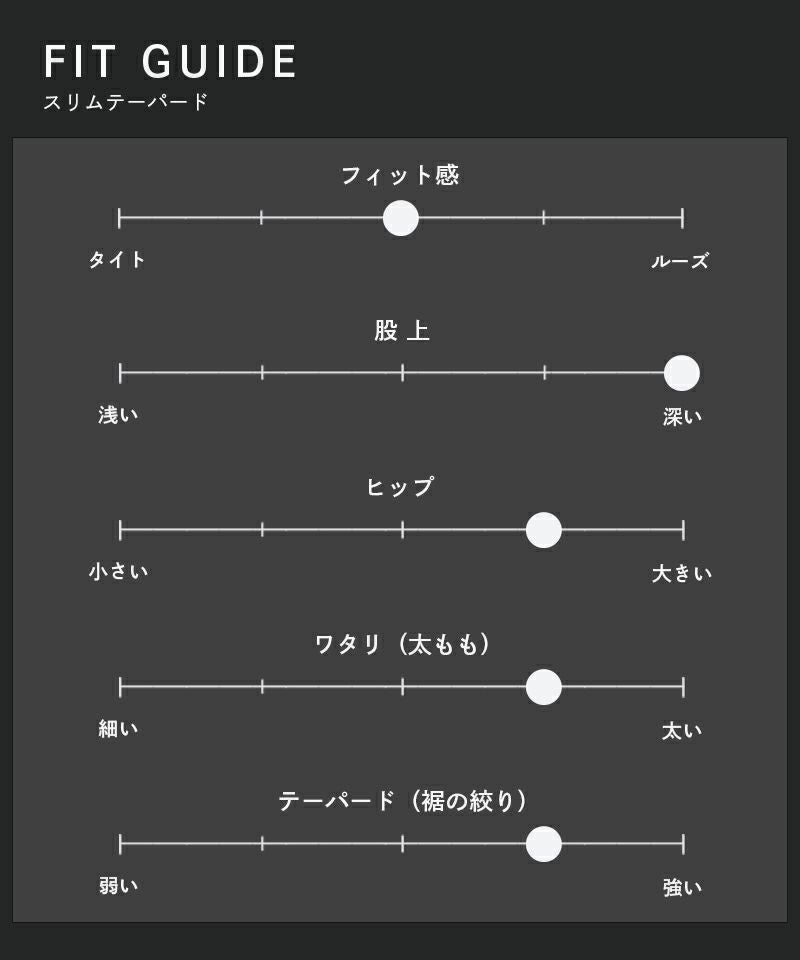 - 強めにテーパードをかけながらもも周りはゆったり目でゆとりを感じるシルエット