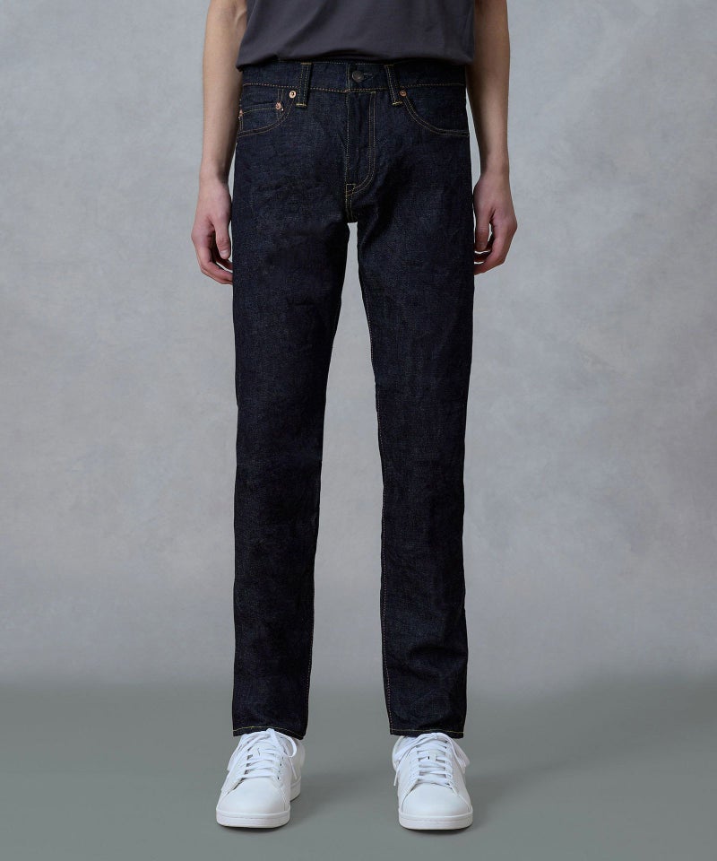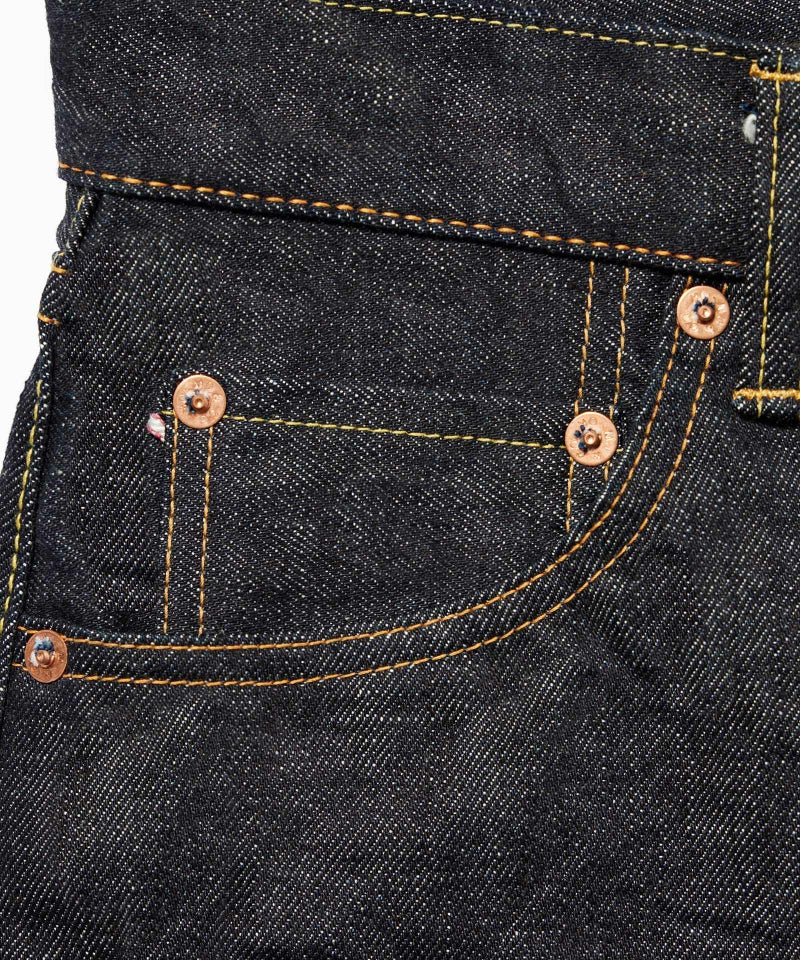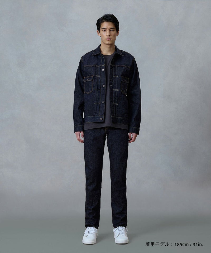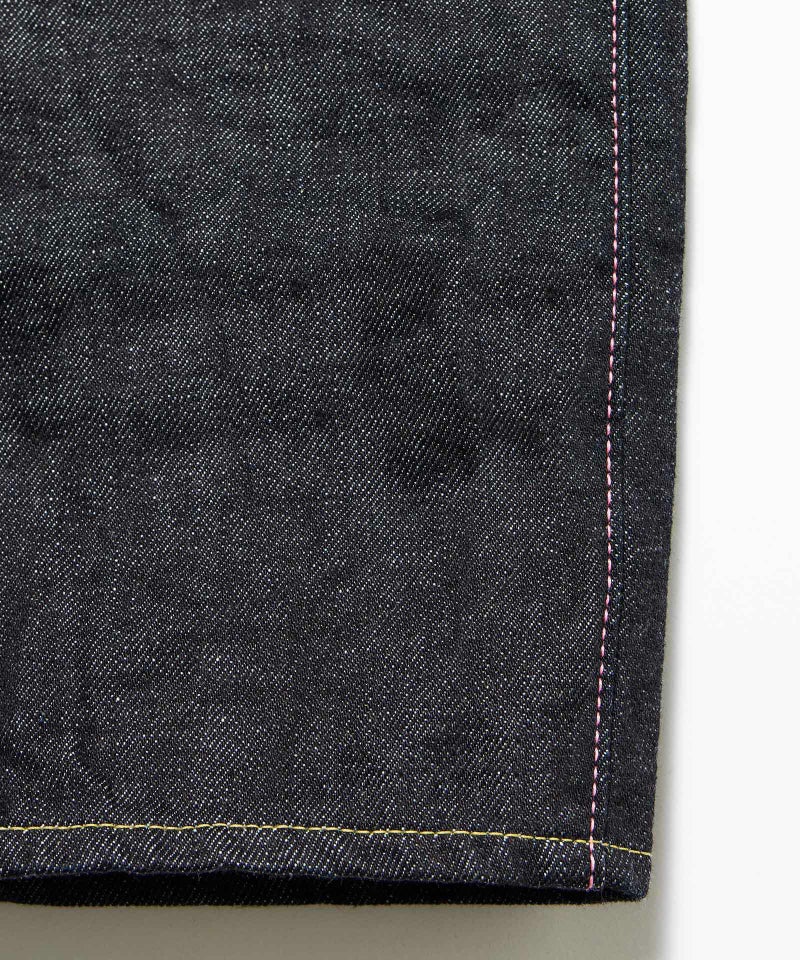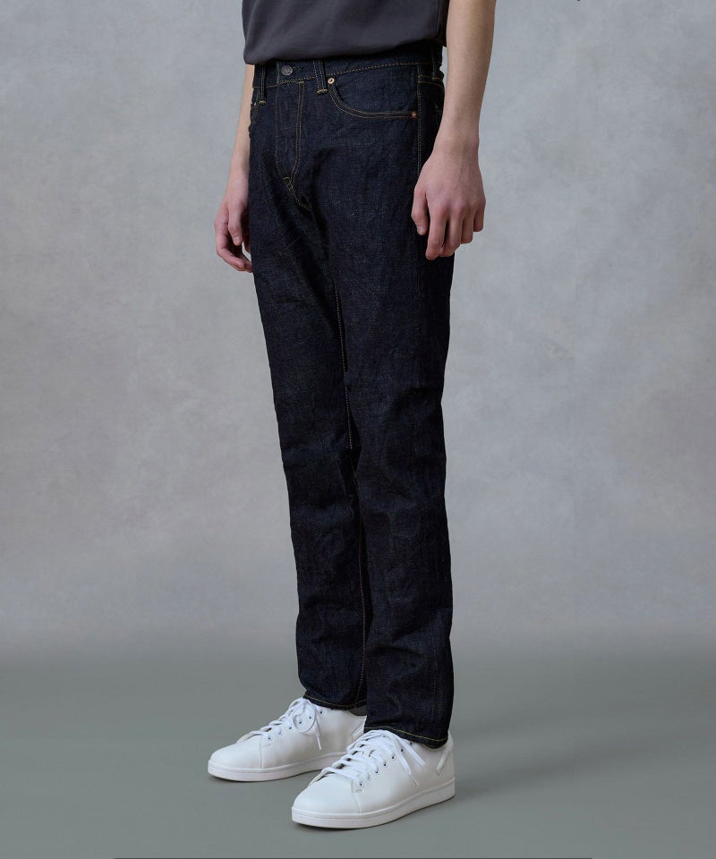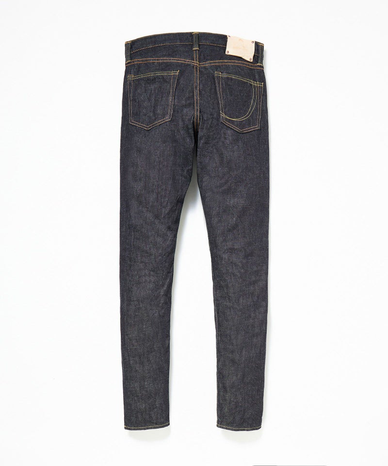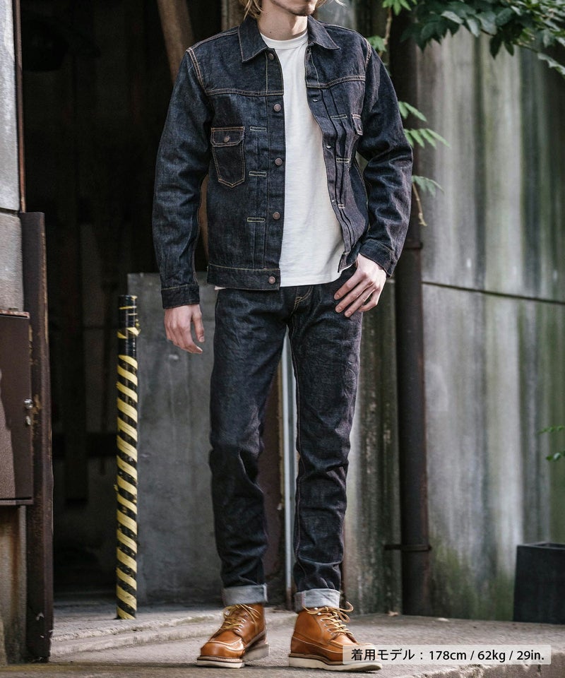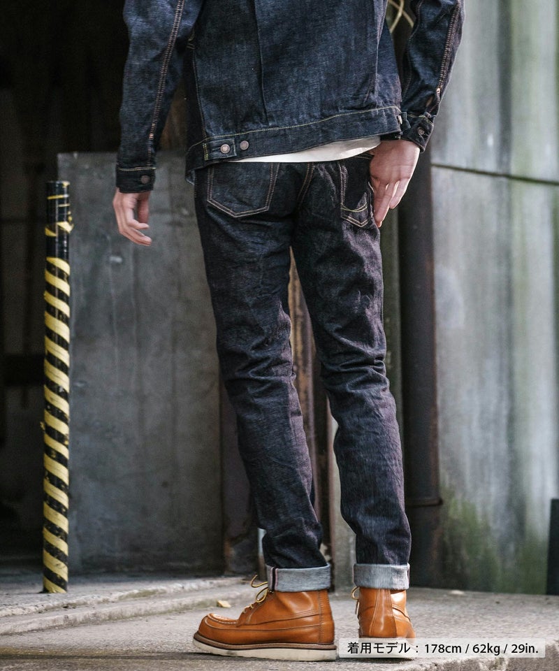 ロープ染色を繰り返し特濃インディゴブルーに染めたジンバブエコットン/6.5番手糸を旧式力織機でゆっくりと織り上げた14.7オンスデニム生地は、力強さのある表情を持ち、濃淡のコントラストのある経年変化と自然なタテ落ちを楽しめます。