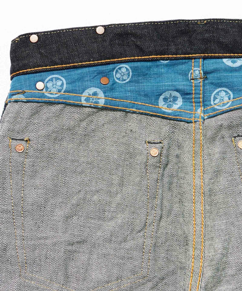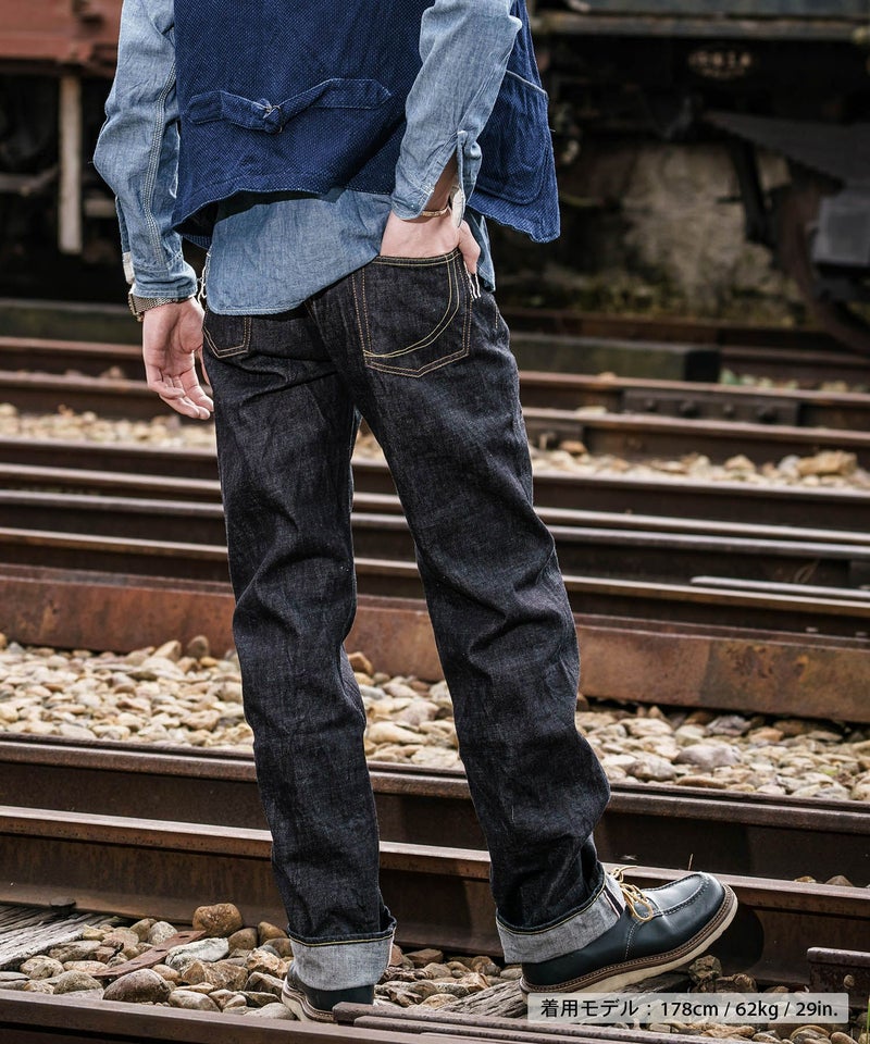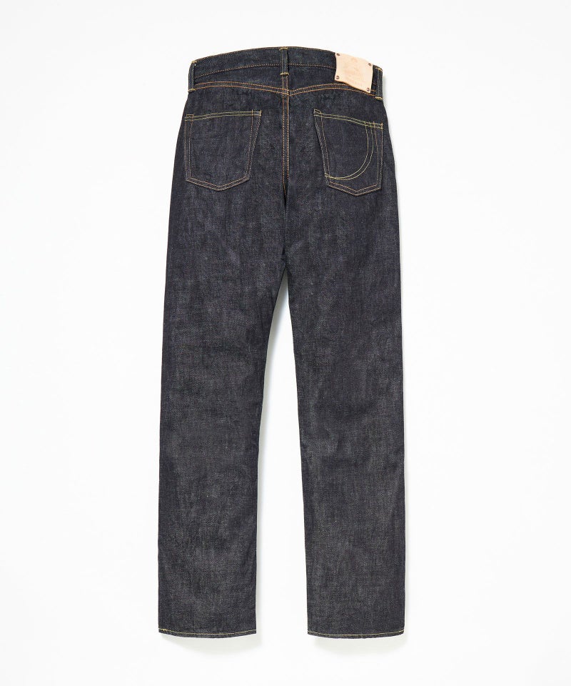 ロープ染色を繰り返し特濃インディゴブルーに染めたジンバブエコットン/6.5番手糸を旧式力織機でゆっくりと織り上げた14.7オンスデニム生地は、力強さのある表情を持ち、濃淡のコントラストのある経年変化と自然なタテ落ちを楽しめます。