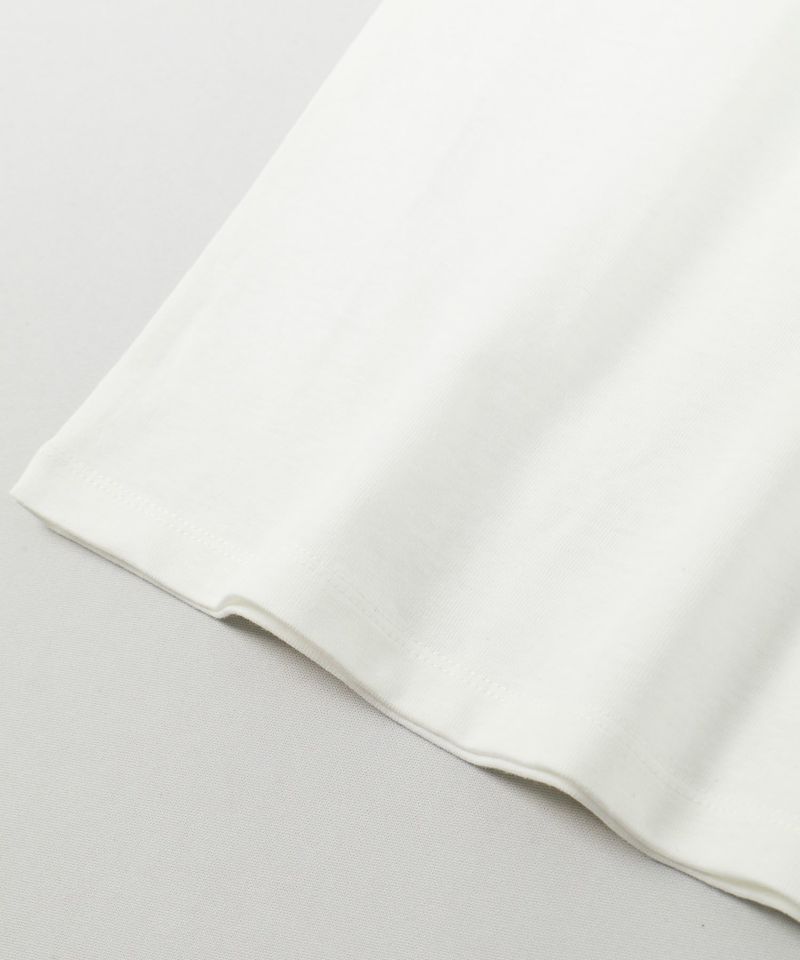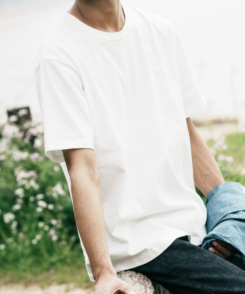 ジンバブエコットン100%、8.5ozのオリジナル度詰め天竺の生地の半袖Tシャツです。14番手/20ゲージのストレート糸で編み上げることで均等な厚みを持ち、手触りや着心地の良さが特長。ぎゅっと目が詰まった肉厚の頼もしい素材感です。首リブは耐久性の高いバインダーネックで着用を繰り返しても伸びにくく、裏の縫い目が着用した時に肌に触れないため快適な着心地を楽しめます。