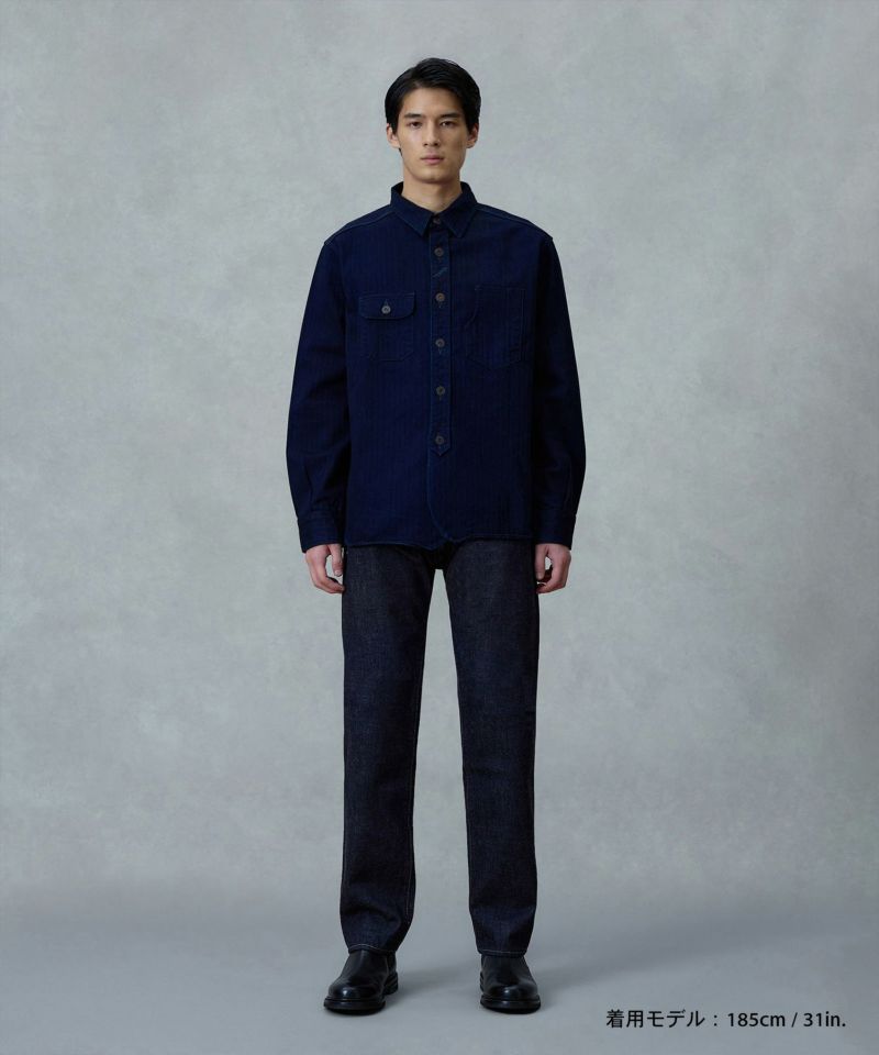 ロープ染色を繰り返し特濃インディゴブルーに染めたジンバブエコットン/6番手糸を旧式力織機でゆっくりと織り上げた15.7オンスデニム生地は、力強さのある表情を持ち、濃淡のコントラストのある経年変化と自然なタテ落ちを楽しめます。防縮加工・捻じれ防止加工・生地表面の弱毛焼き加工は行っていません。