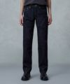 ロープ染色を繰り返し特濃インディゴブルーに染めたジンバブエコットン/6番手糸を旧式力織機でゆっくりと織り上げた15.7オンスデニム生地は、力強さのある表情を持ち、濃淡のコントラストのある経年変化と自然なタテ落ちを楽しめます。防縮加工・捻じれ防止加工・生地表面の弱毛焼き加工は行っていません。