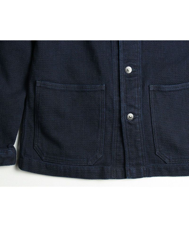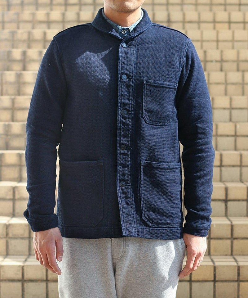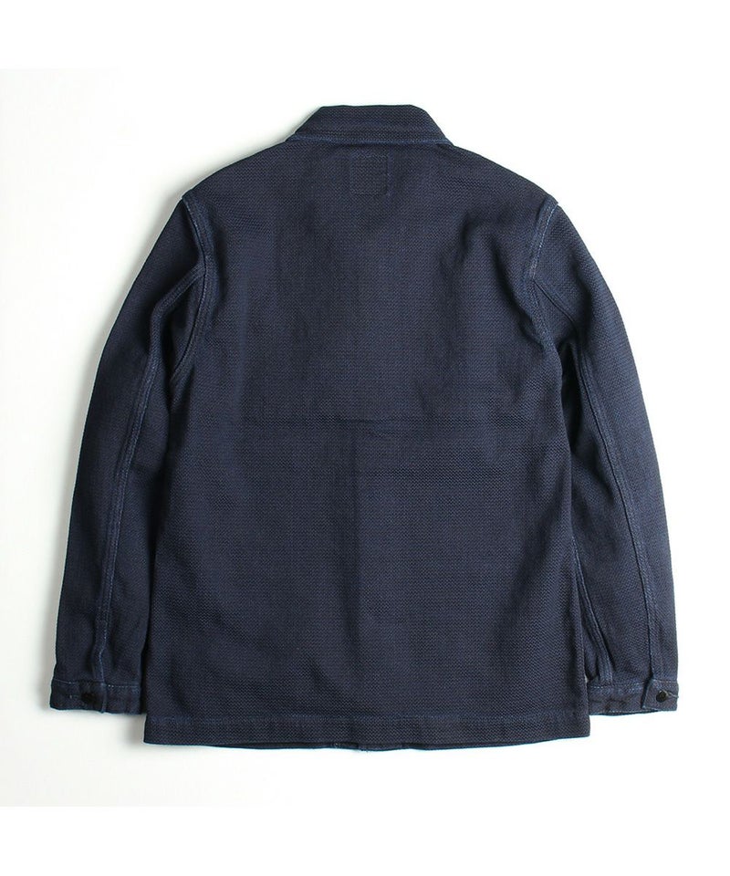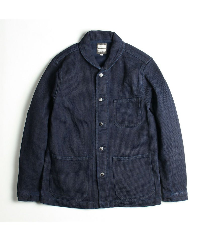 USネイビー(アメリカ海軍)のウエアをモチーフとしたシンプルなショールカバーオールです。裏地無しの一重(ひとえ)のジャケットです。刺子(さしこ)風ドビー織りの生地は武骨さと独特のユルさを併せ持ち、デニムとは一味違った風合いを楽しめます。