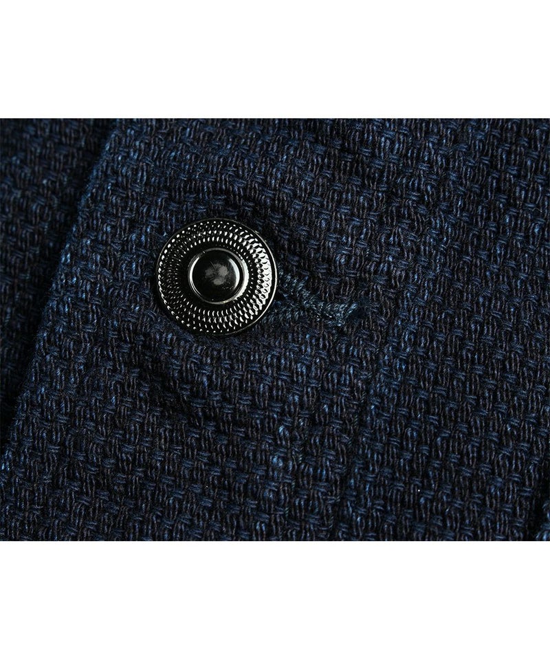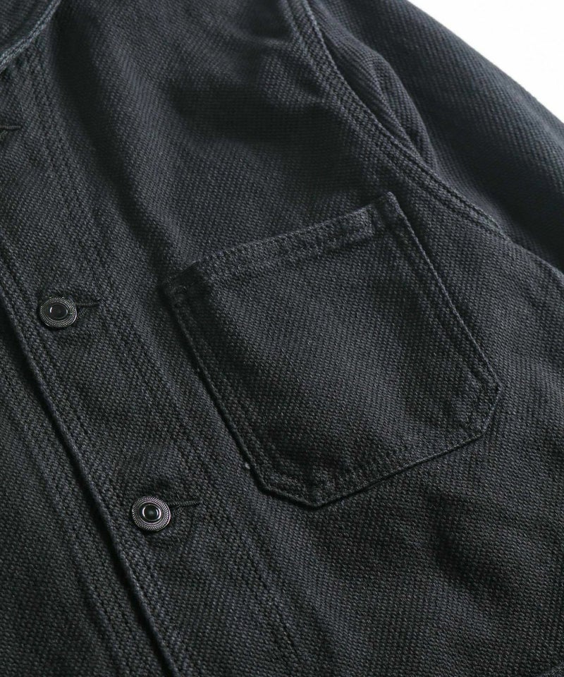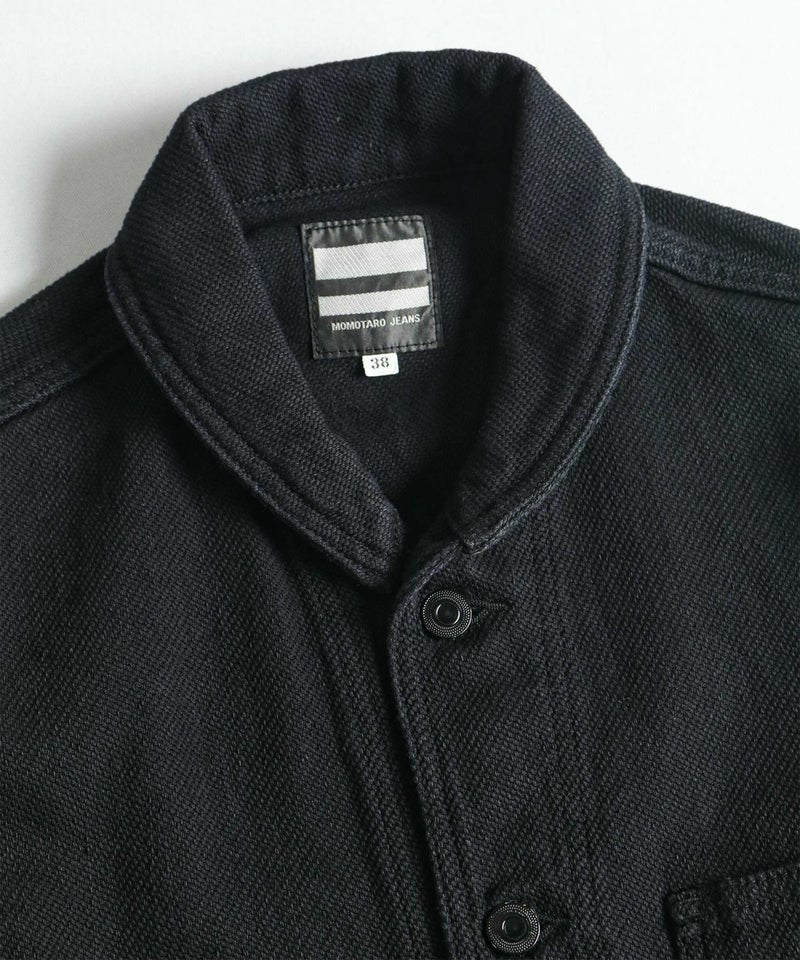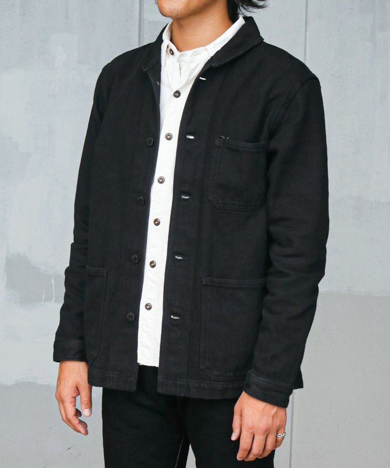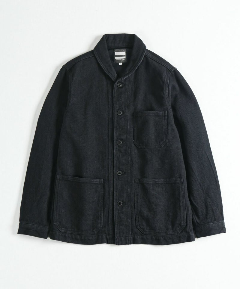USネイビー(アメリカ海軍)のウエアをモチーフとしたシンプルなショールカバーオールです。裏地無しの一重(ひとえ)のジャケットです。刺子(さしこ)風ドビー織りの生地は武骨さと独特のユルさを併せ持ち、デニムとは一味違った風合いを楽しめます。