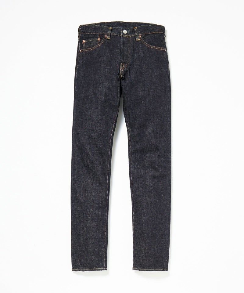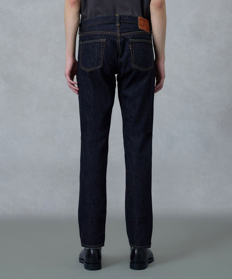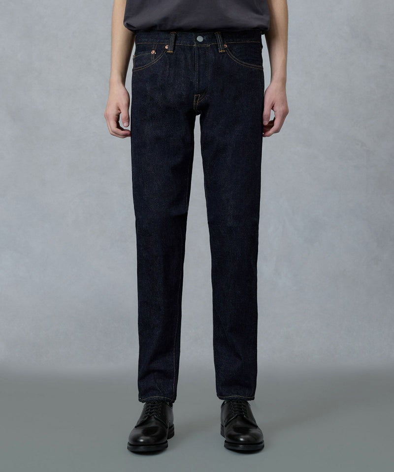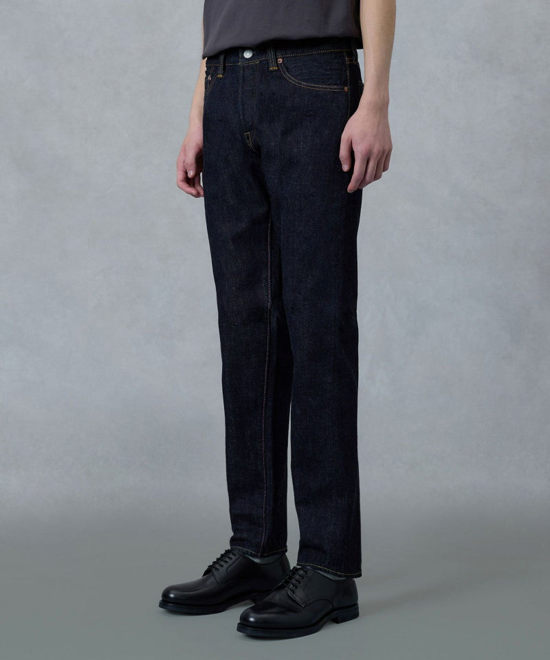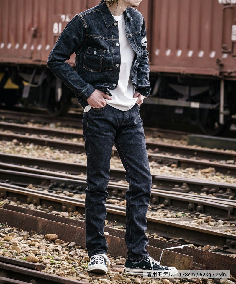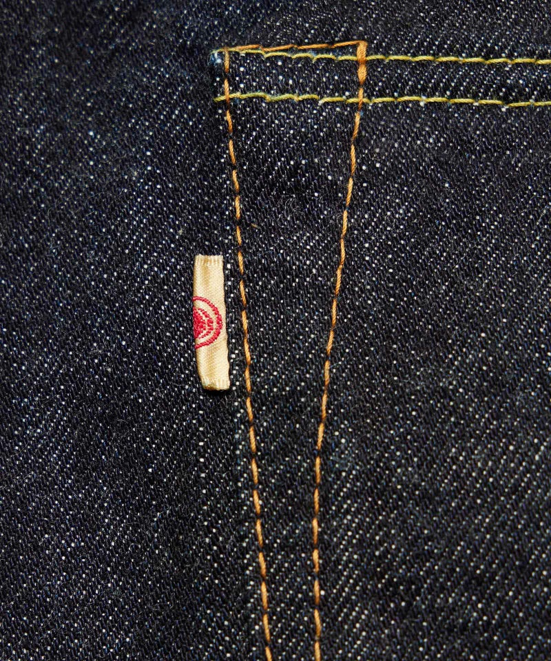 ロープ染色を繰り返し特濃インディゴブルーに染めたジンバブエコットン/6番手糸を旧式力織機でゆっくりと織り上げた15.7オンスデニム生地は、力強さのある表情を持ち、濃淡のコントラストのある経年変化と自然なタテ落ちを楽しめます。防縮加工・捻じれ防止加工・生地表面の弱毛焼き加工は行っていません。
