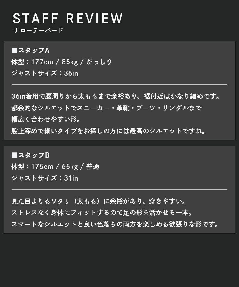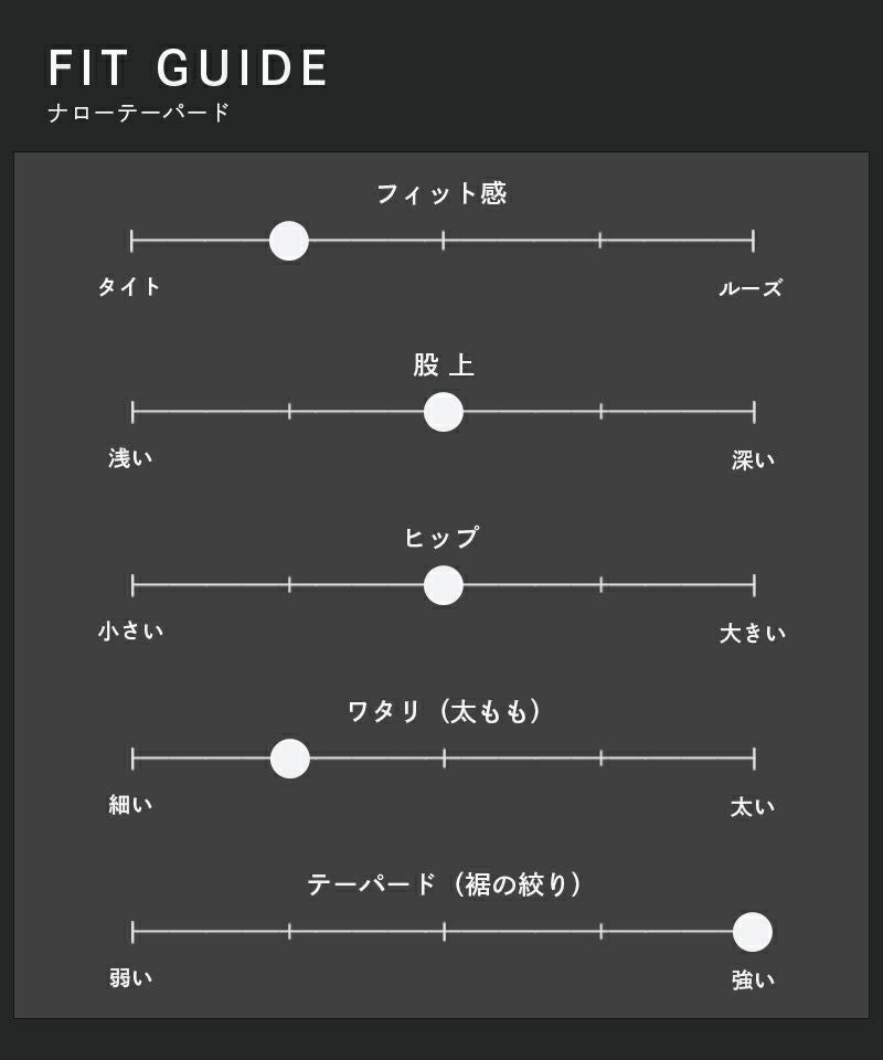 - 強くテーパードをかけた細めのシルエット