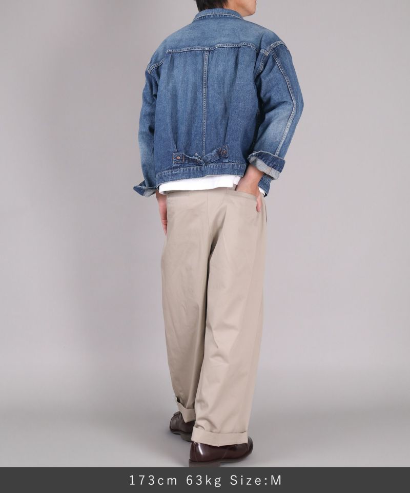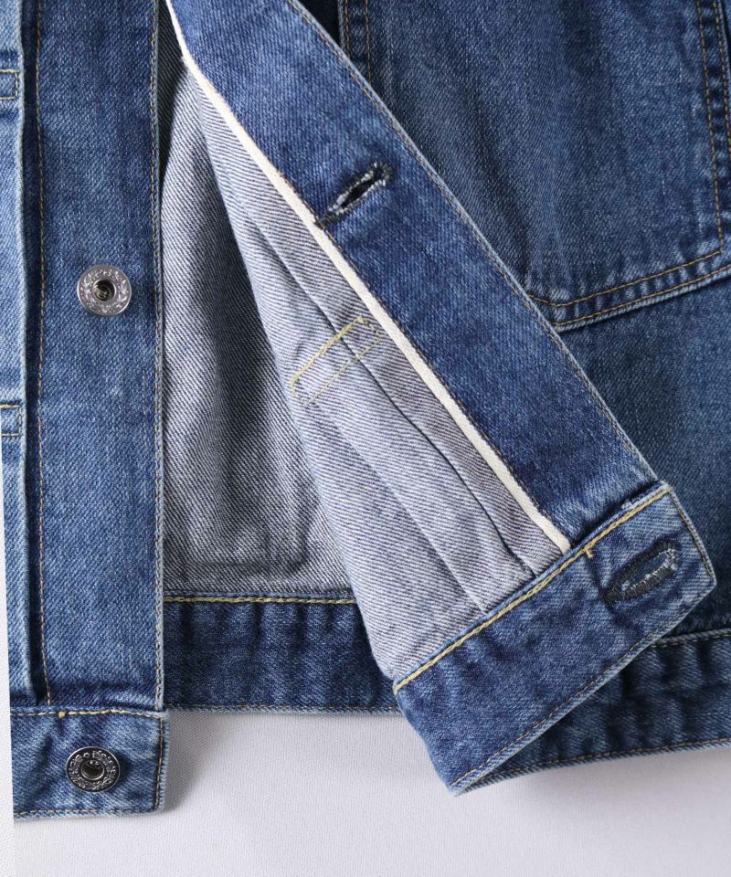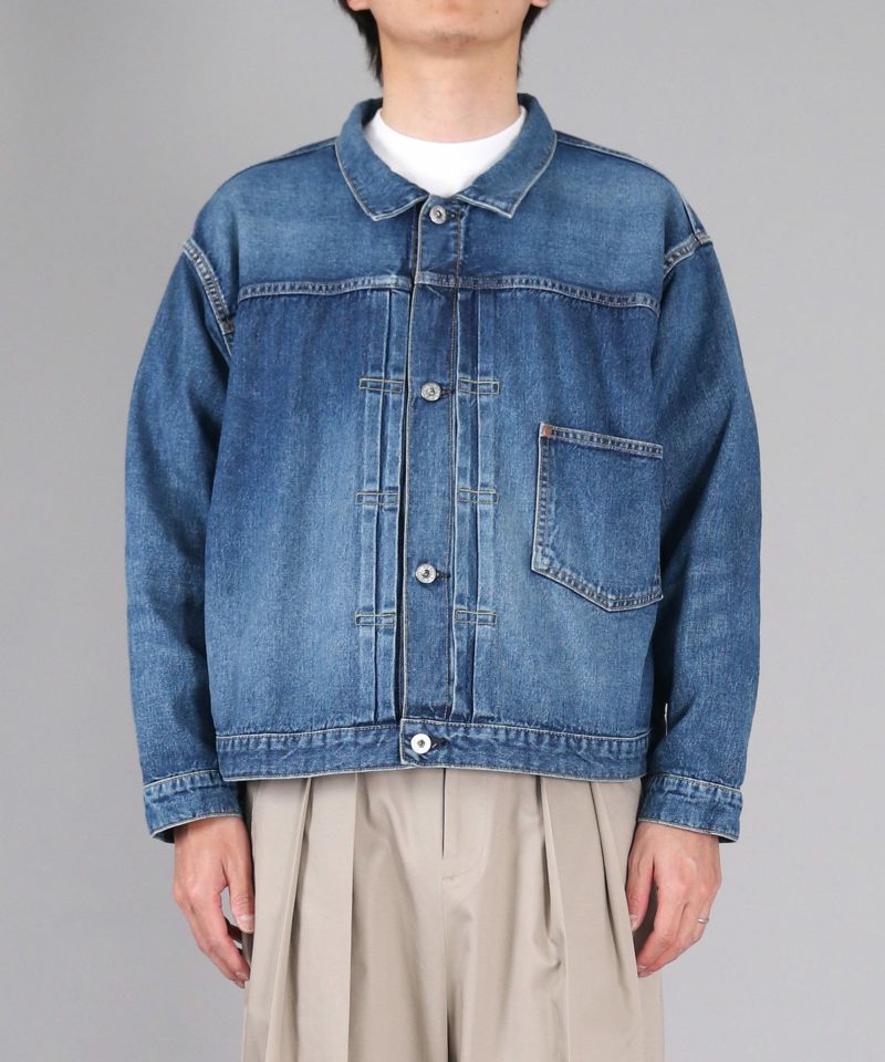 短めの着丈×ボックスシルエットに、前身頃のアクションプリーツやボックスステッチなど、1st型ならではのディテールを忠実に再現。