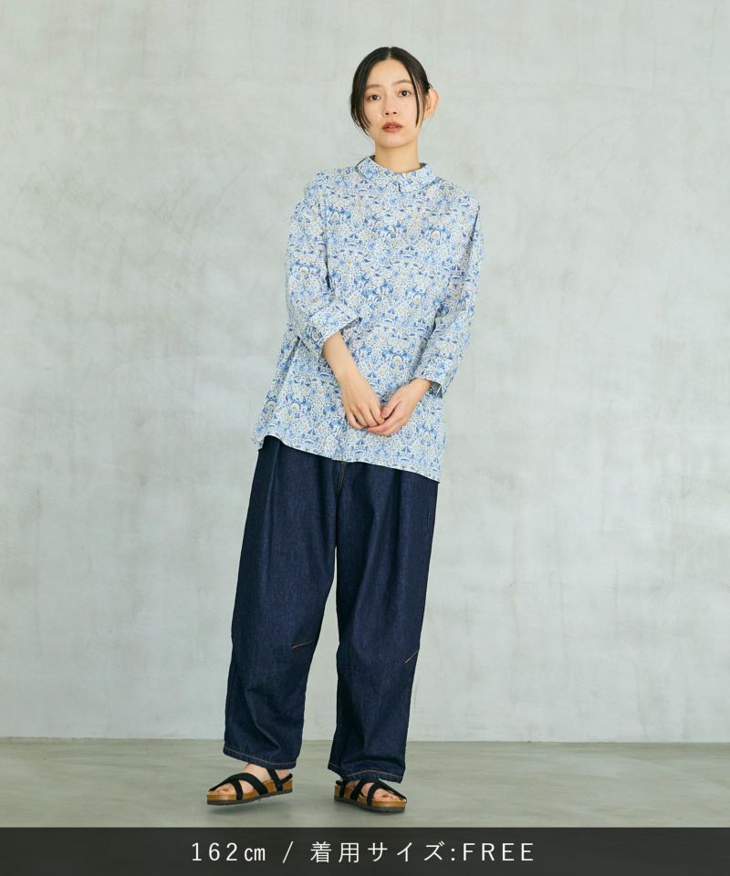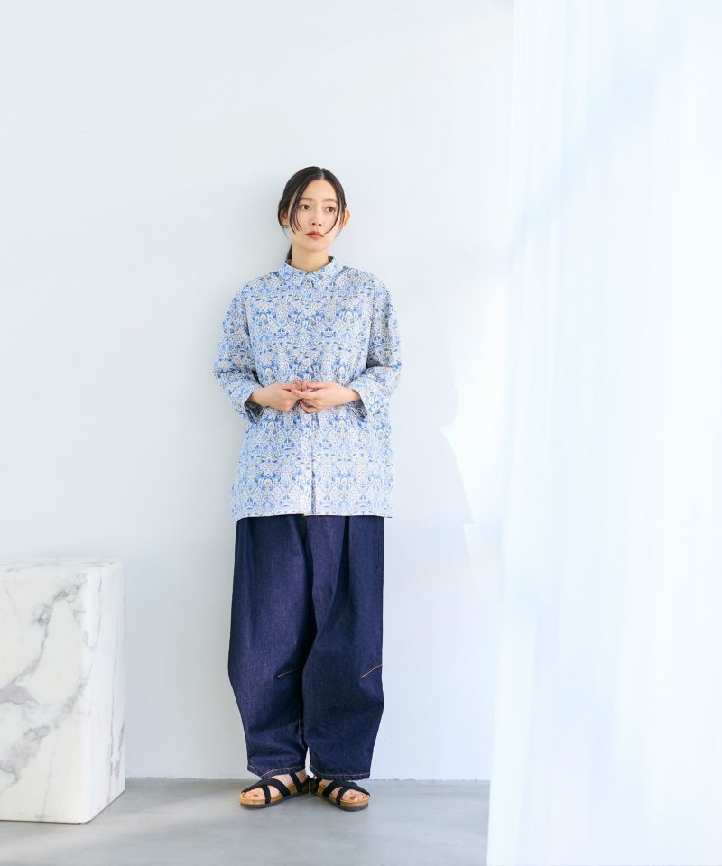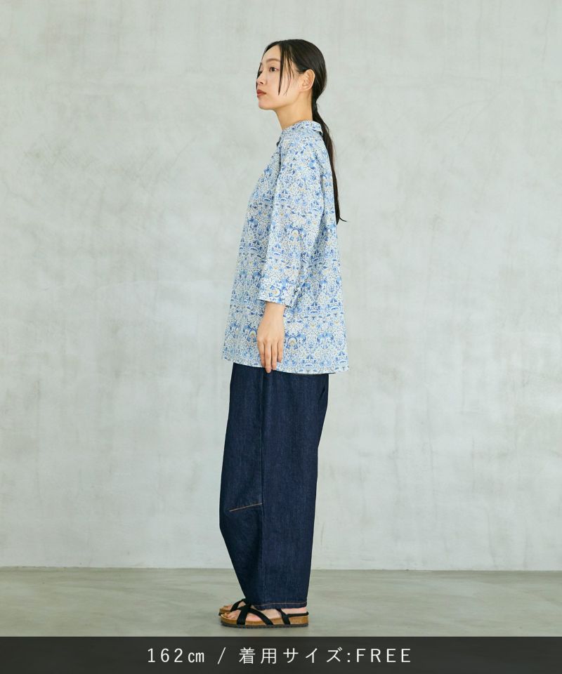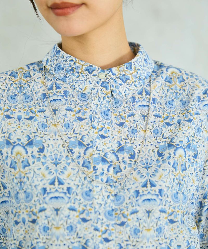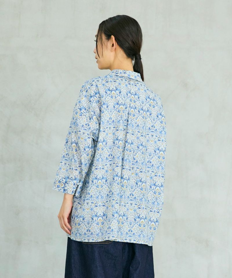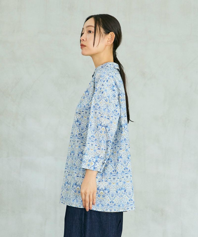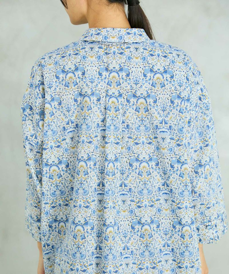 リバティプリントを日常に気負わず楽しめる、襟付きの七分袖シャツ。
