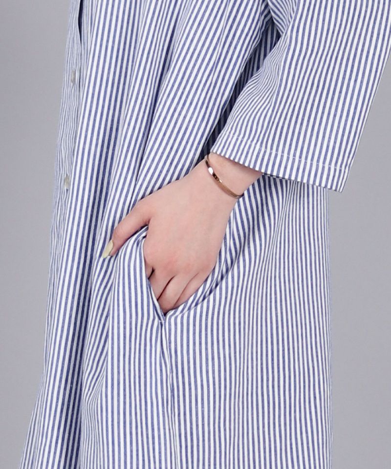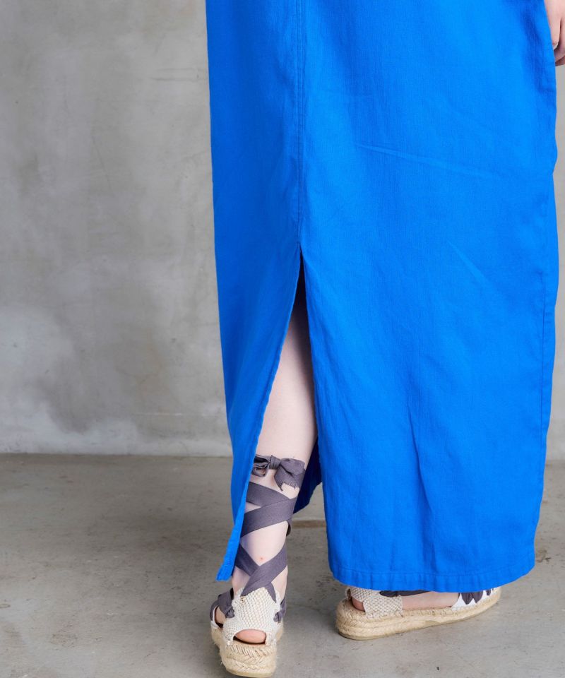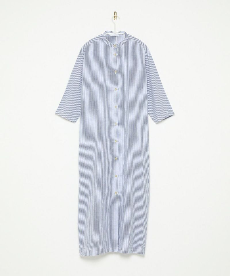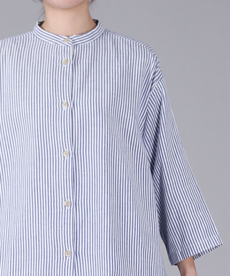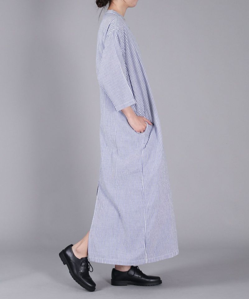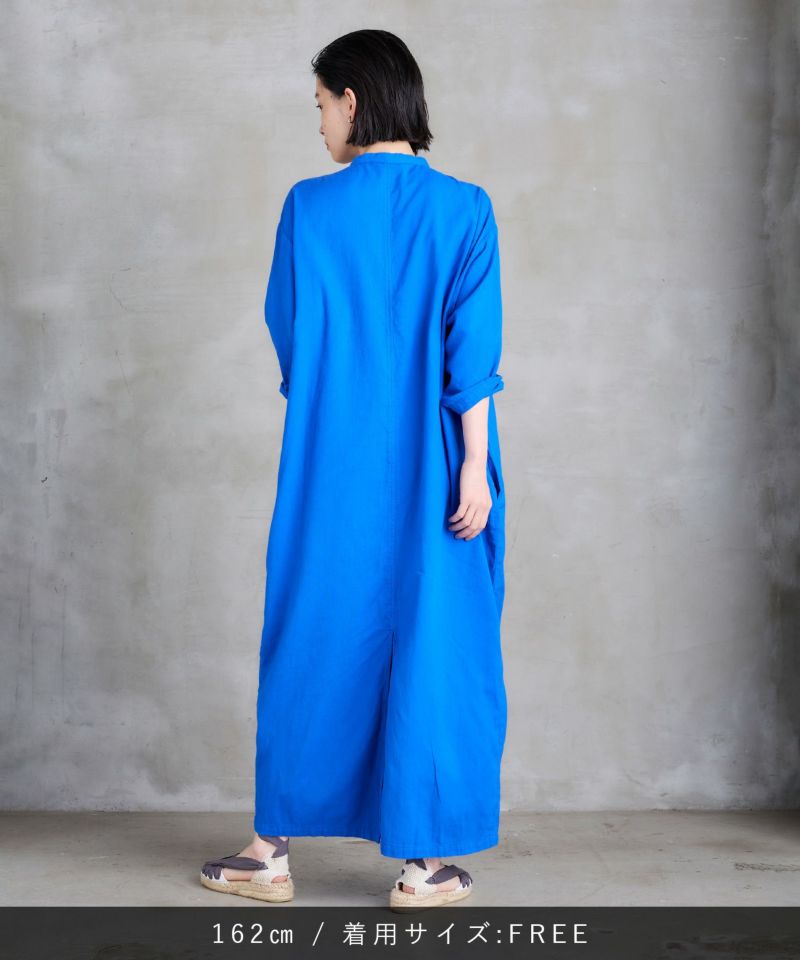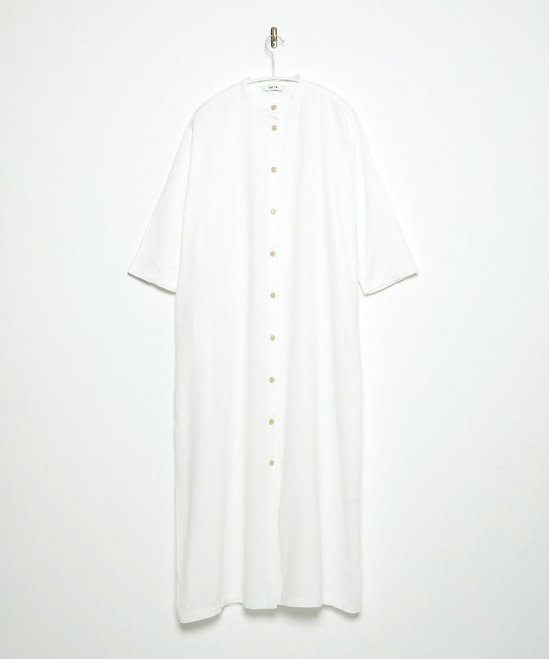 バンドカラーで首元はすっきりと、バックには大きくスリットが入っているから軽やかな印象に。
