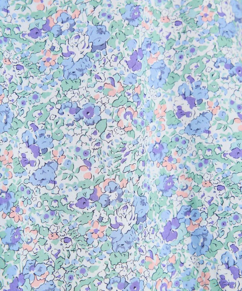 タナローン生地のくすみがかったブルーグリーンをベースに斑点と東洋の花が描かれたデザインと、ブルーや紫などの小花をラフなタッチで描いたデザインを使用。