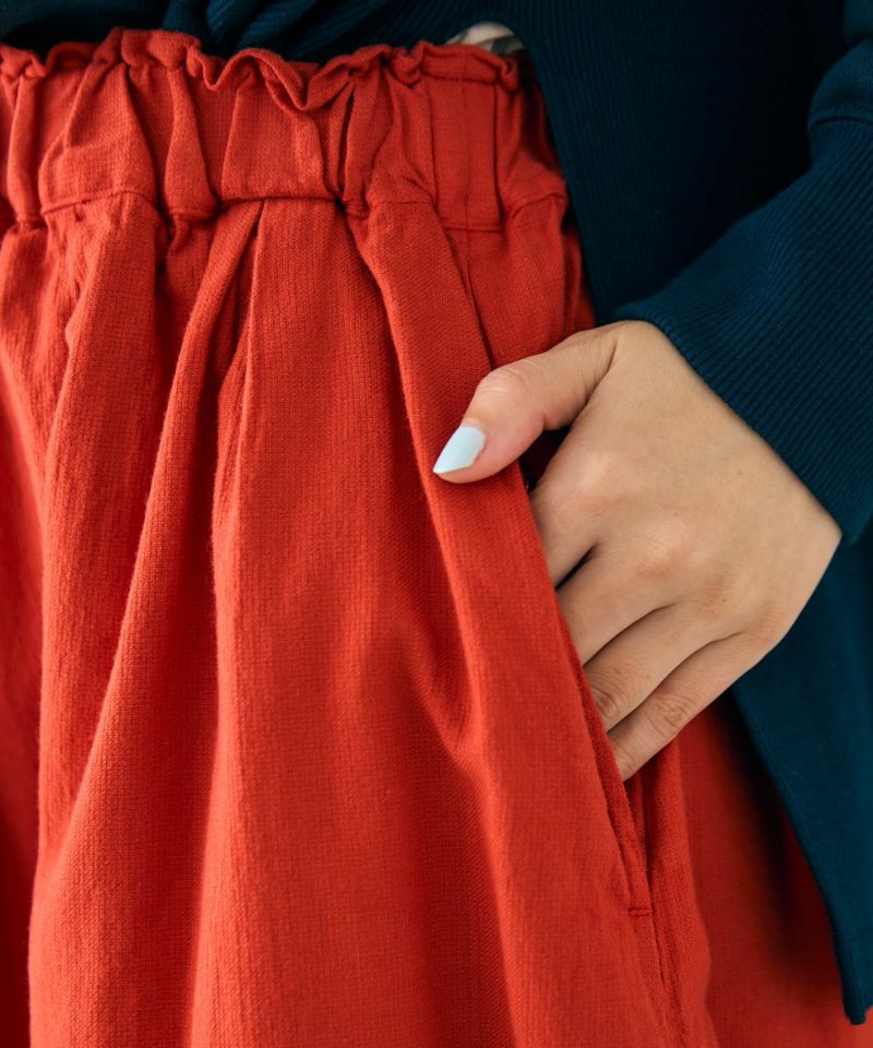 ウエストまわりに細かくタックの入った広がりのあるスカート。