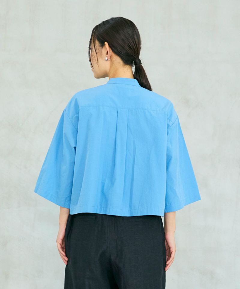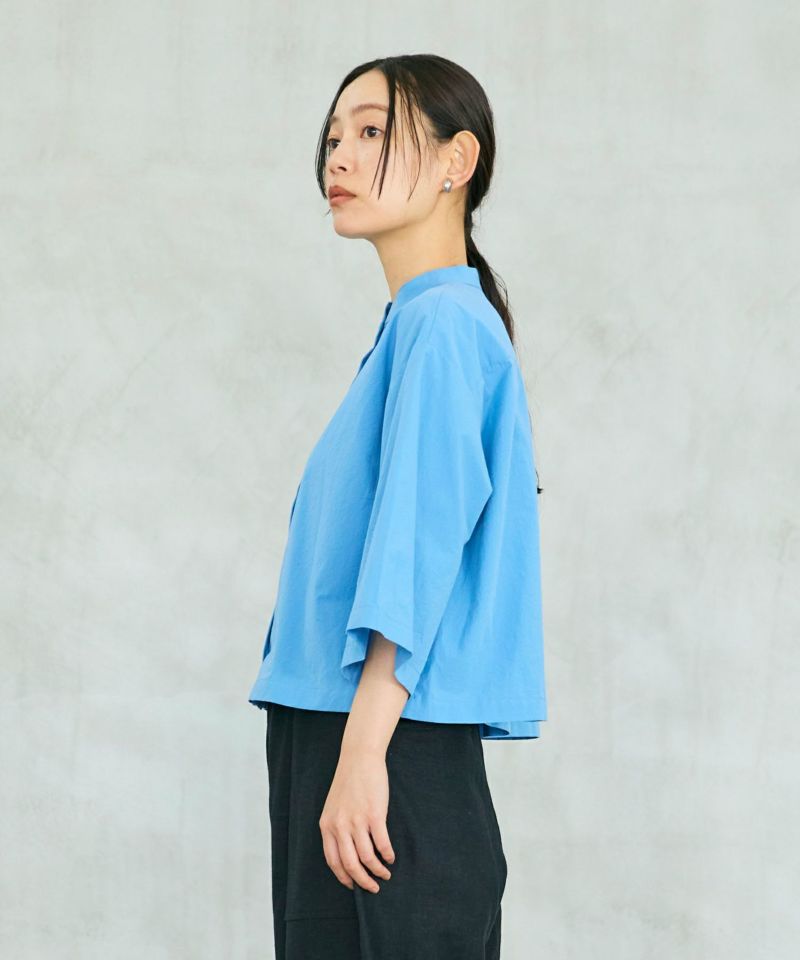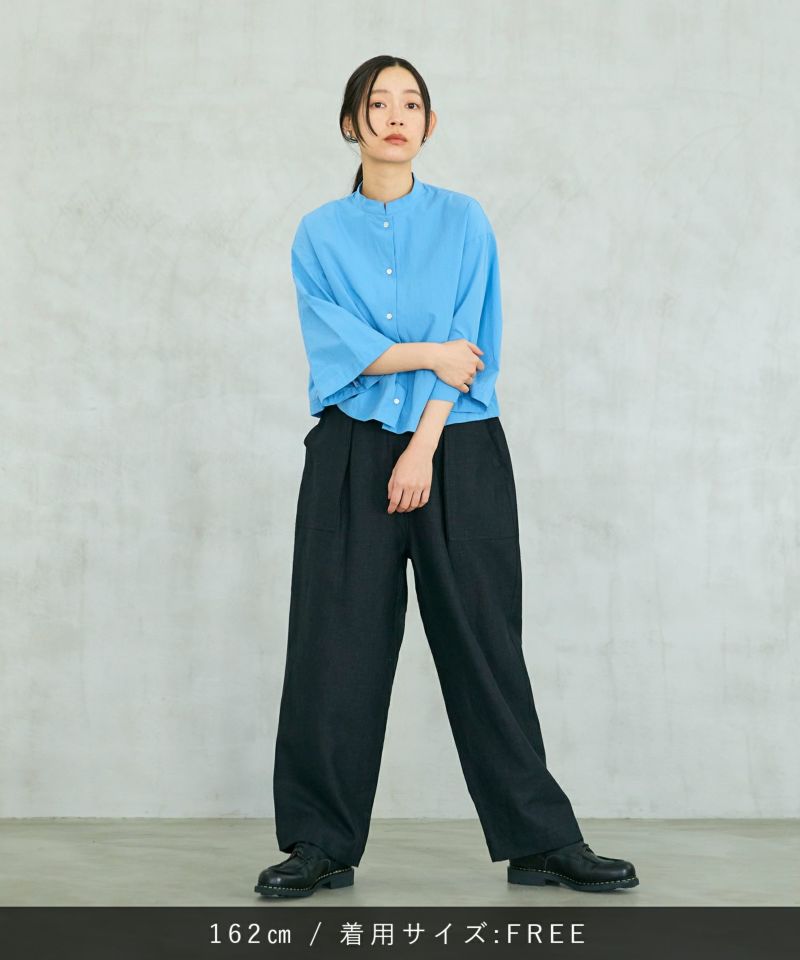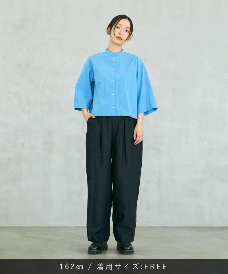 首もとはバンドカラーで、顔まわりがすっきり見えるのも嬉しいポイント。