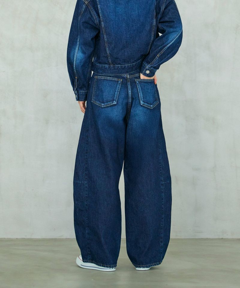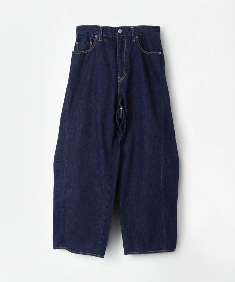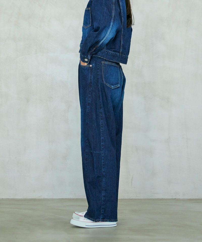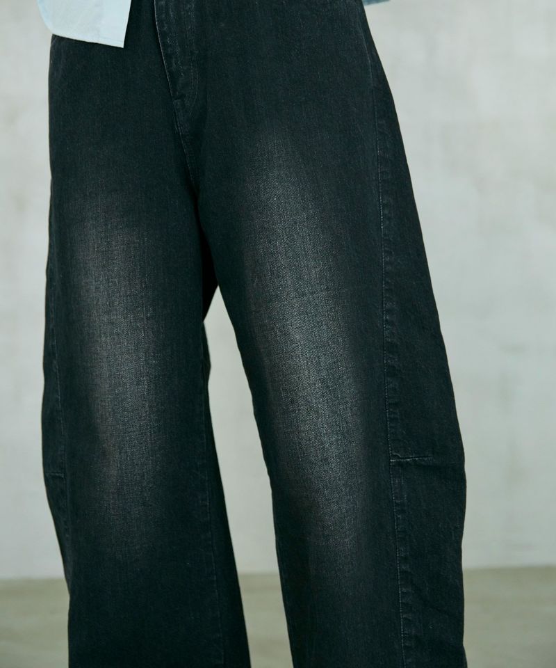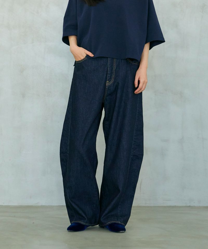 パネルのように縫製された立体的なシルエットのワイドジーンズ。