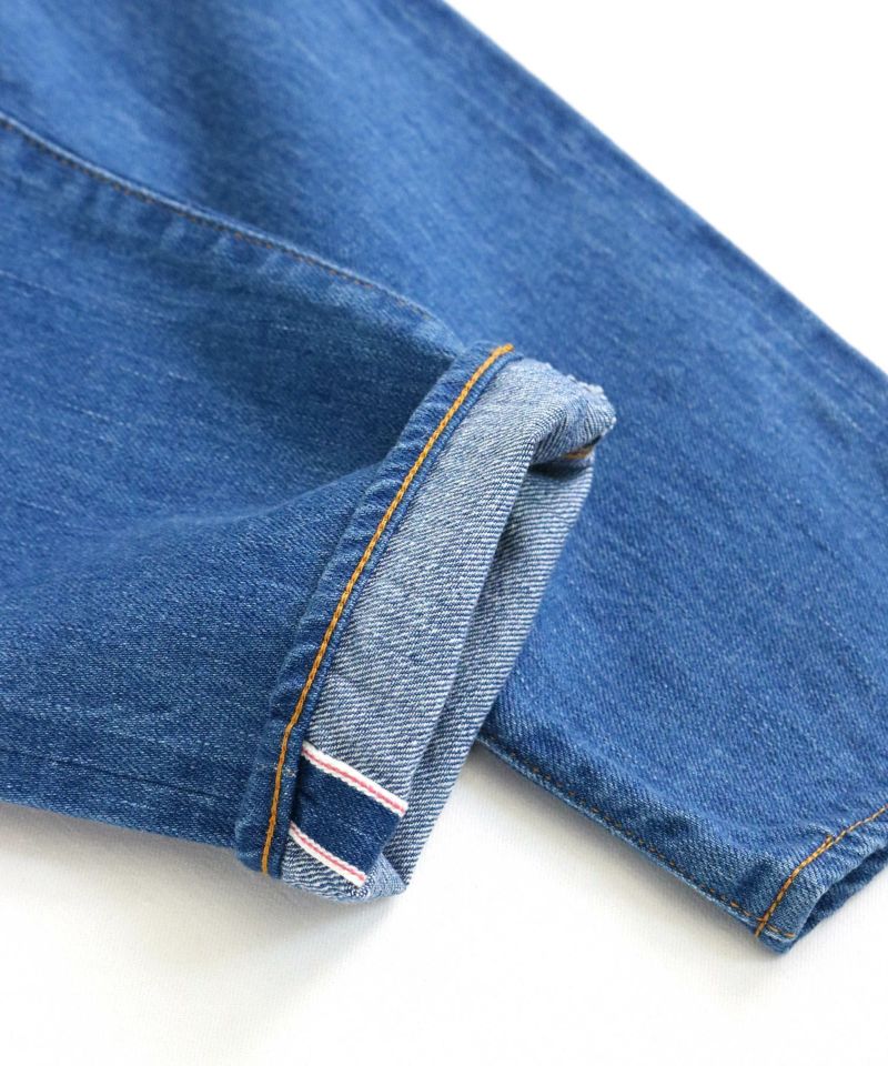 ヴィンテージウォッシュ加工を施した、鮮やかなブルーが映えるジーンズです。