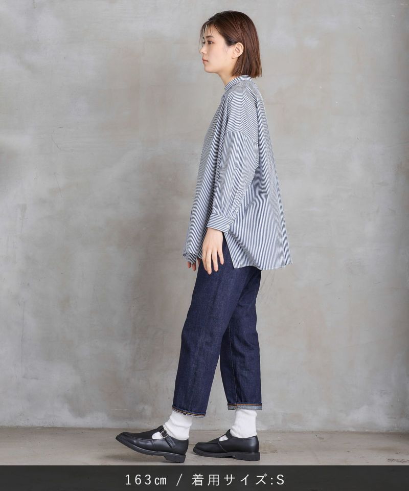 柔らかい生地ながらも程よい厚みがあるので透けにくい素材となっています。裾を折り返した時の赤耳がポイント。