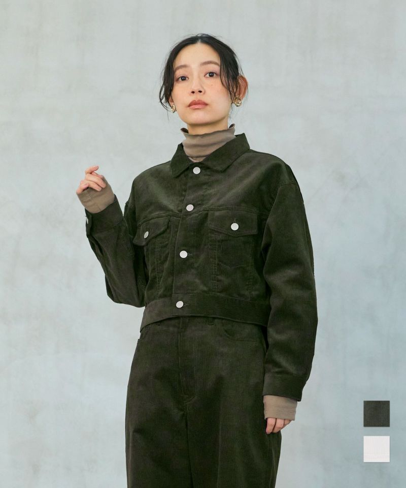 コーデュロイ生地で仕立てた、コンパクトで丸みを帯びたシルエットのジャケット。