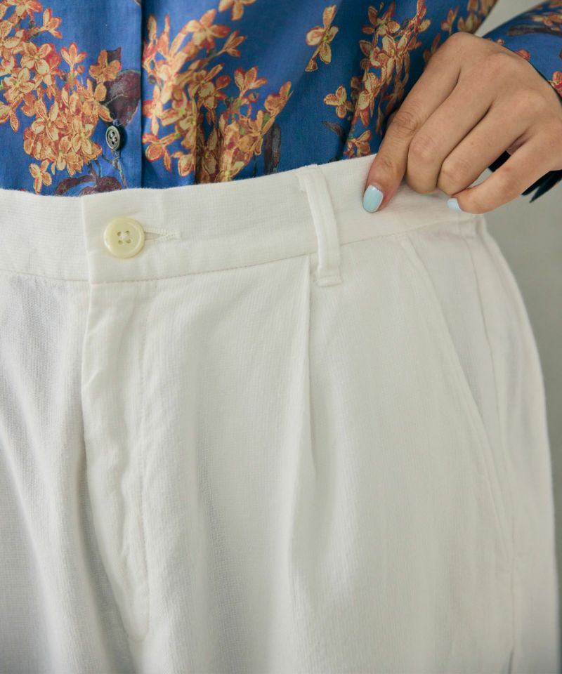 長めのレングスで足元は裾に生地がたまるルーズさが特徴。