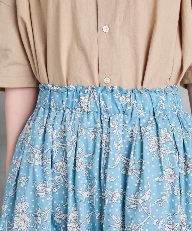 タナローン生地のくすみがかったブルーグリーンをベースに斑点と東洋の花が描かれたデザインと、ブルーや紫などの小花をラフなタッチで描いたデザインを使用。