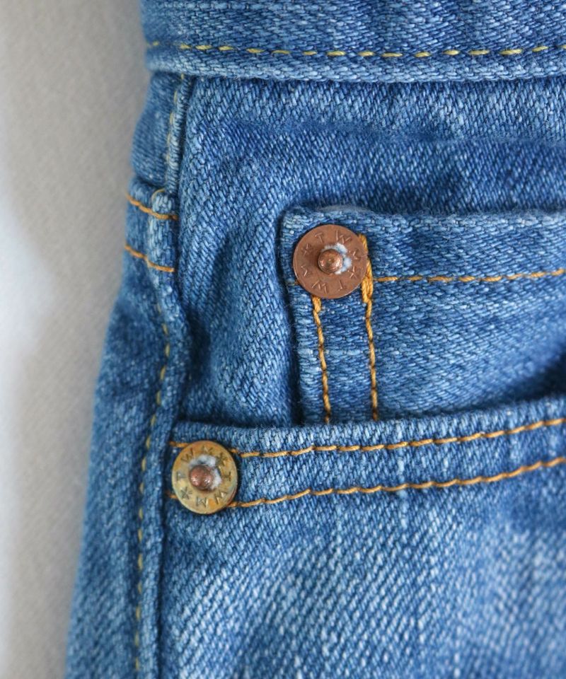 ヴィンテージウォッシュ加工を施した、鮮やかなブルーが映えるジーンズです。