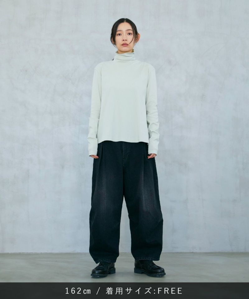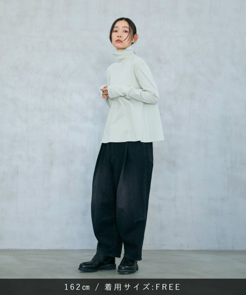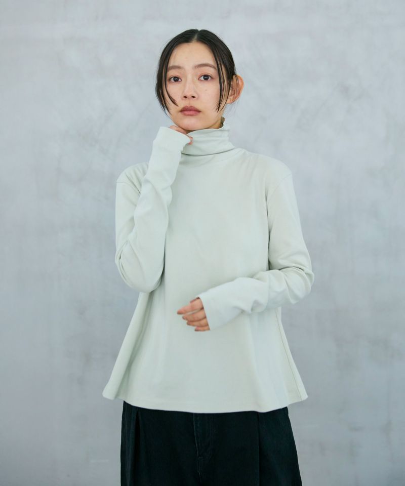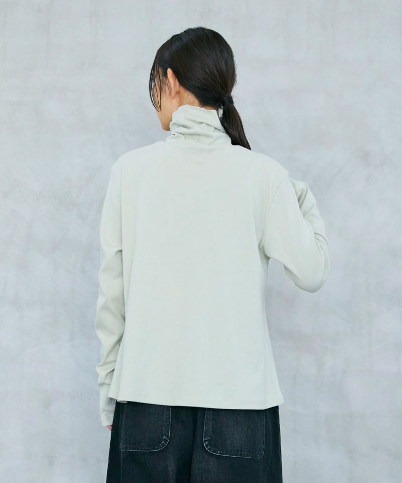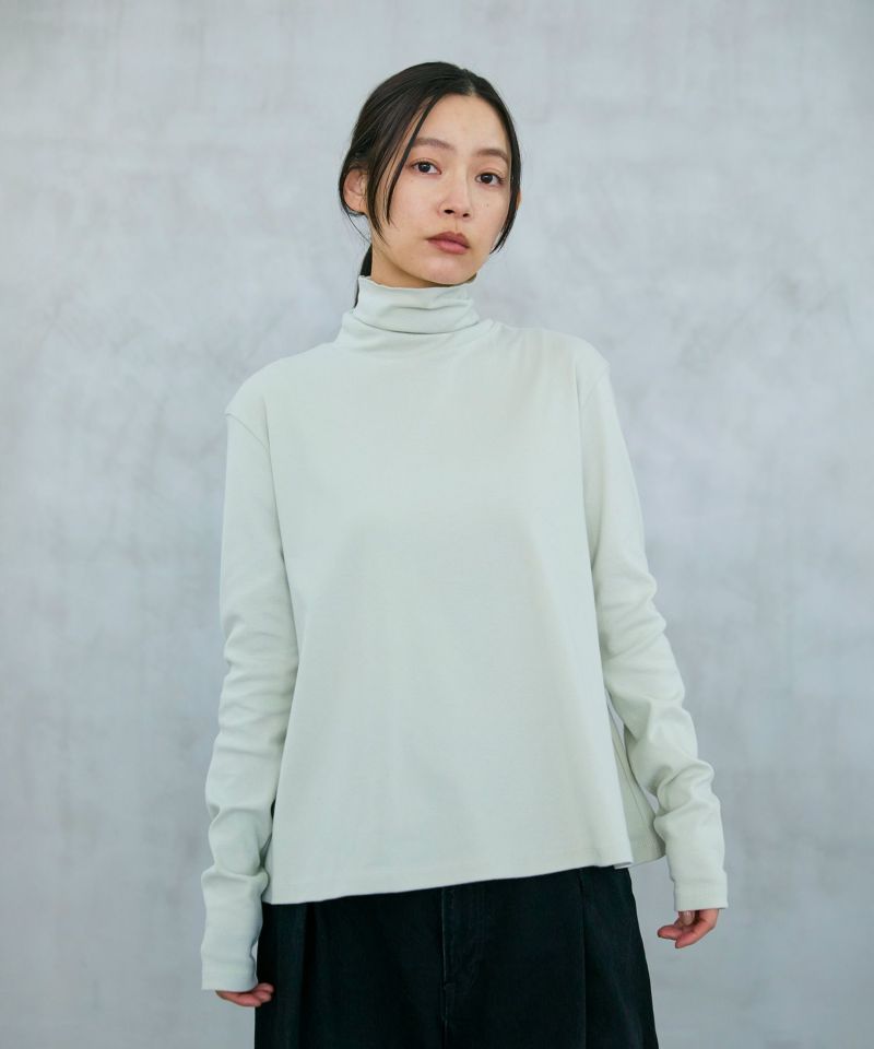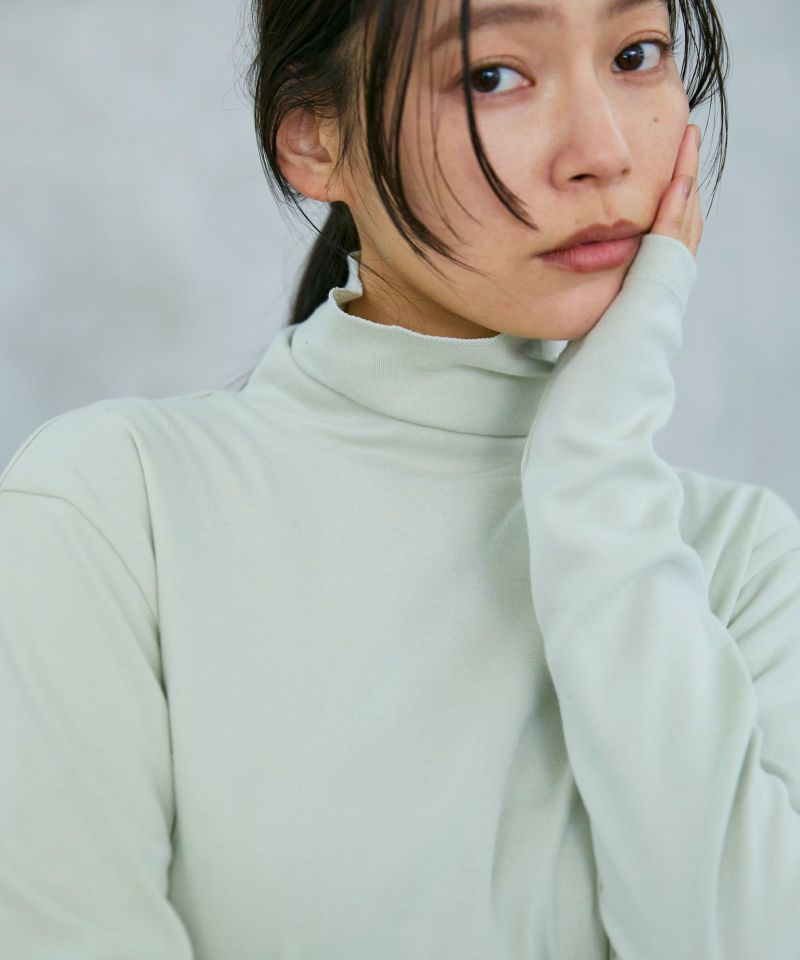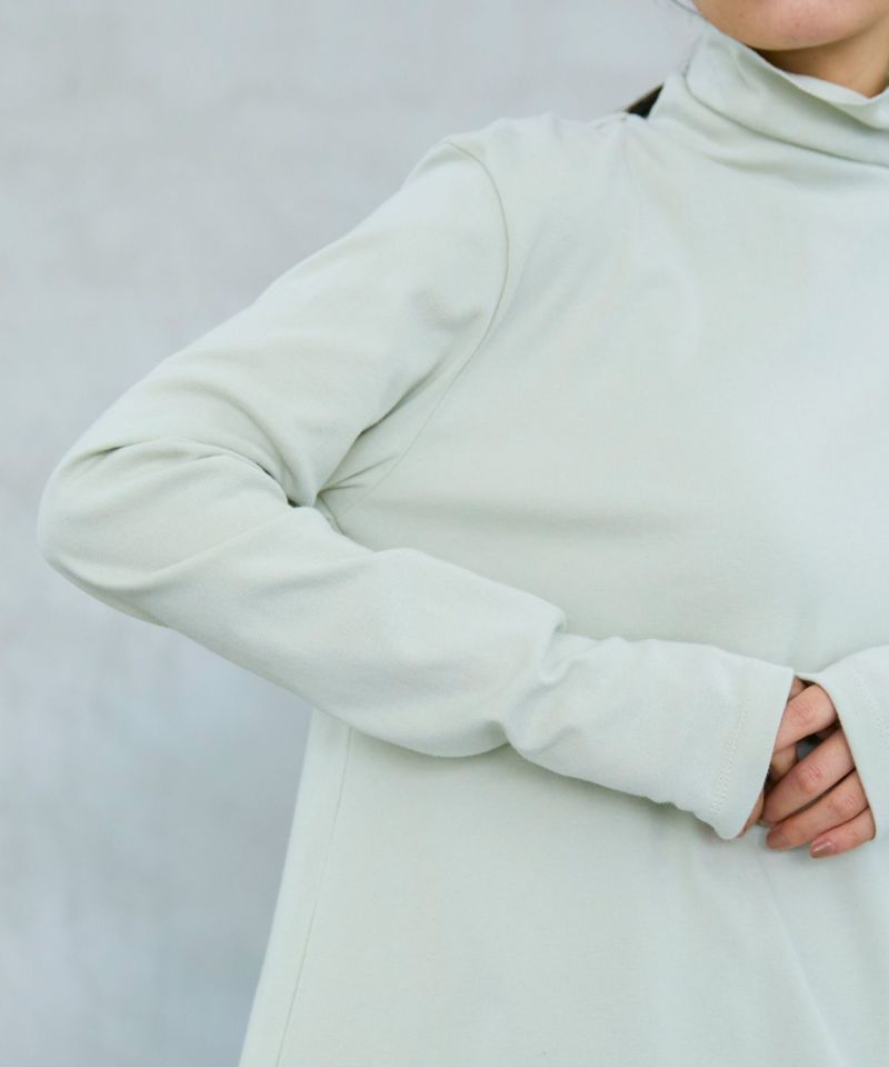 やや長めに仕立てたネックが、首元をやさしく包み込むデザイン。