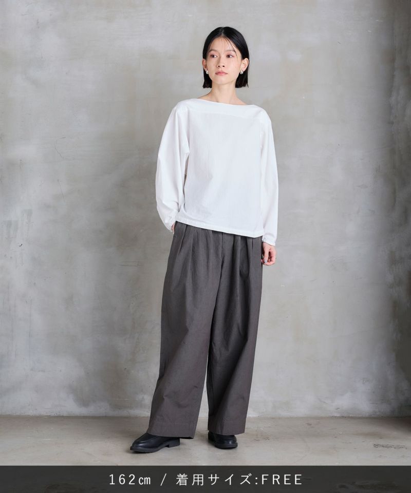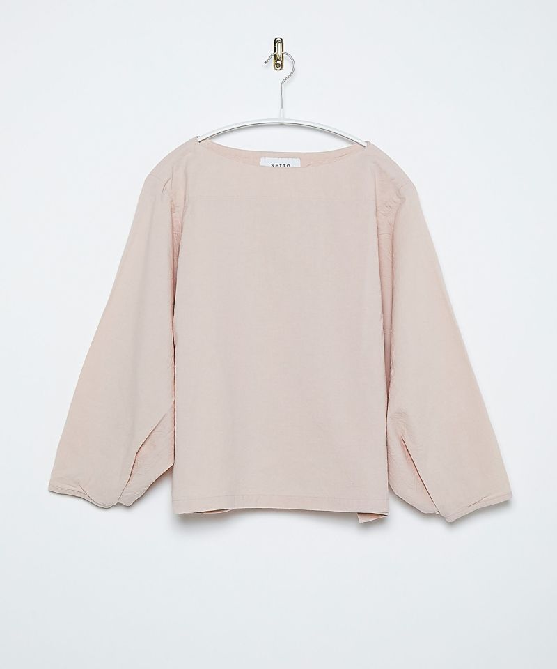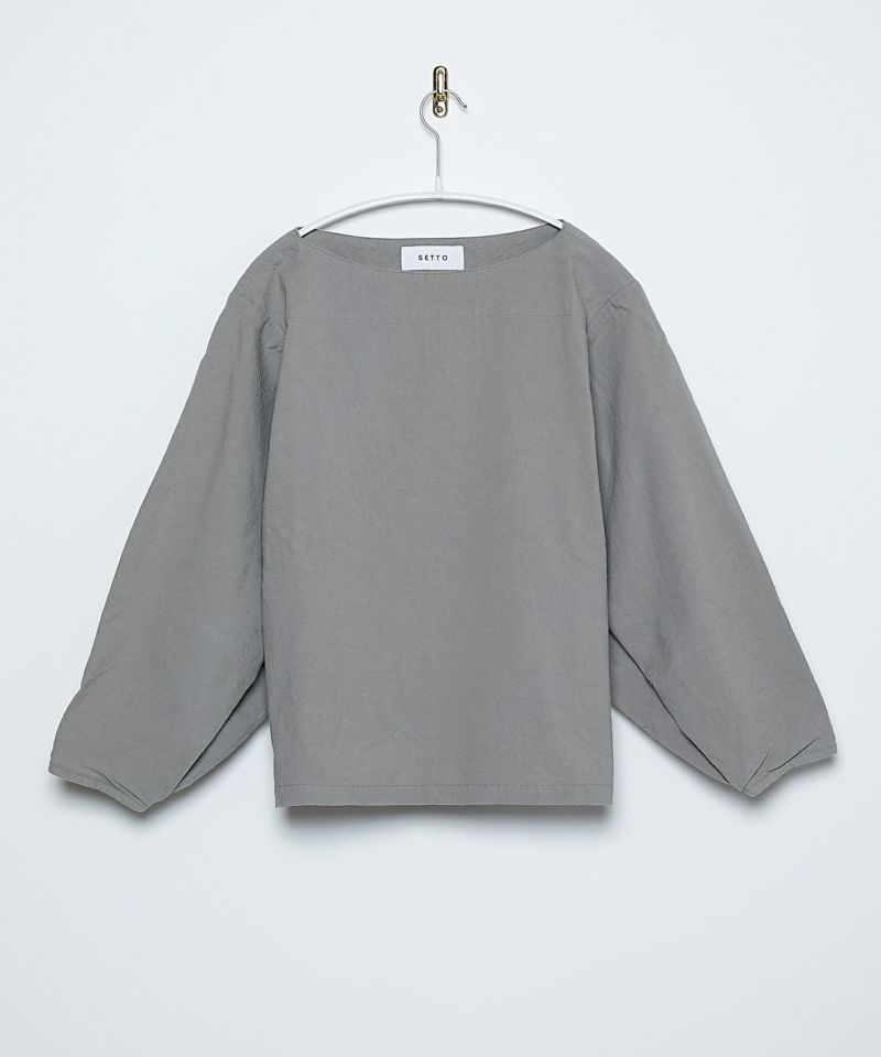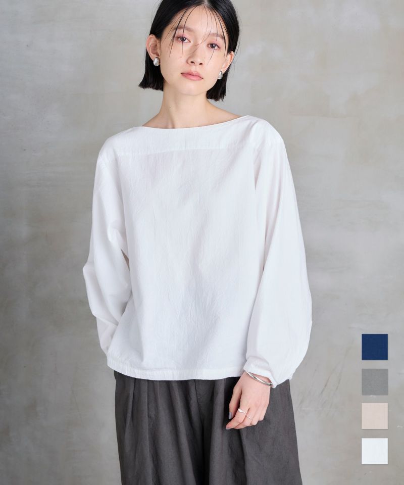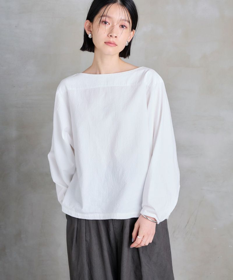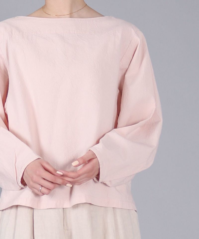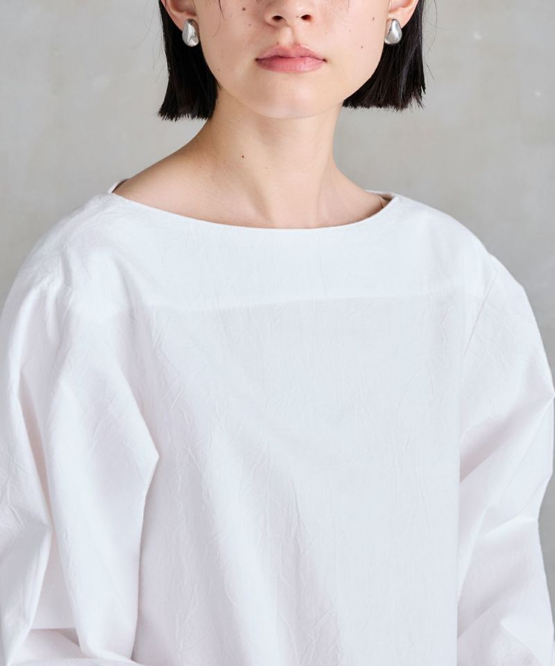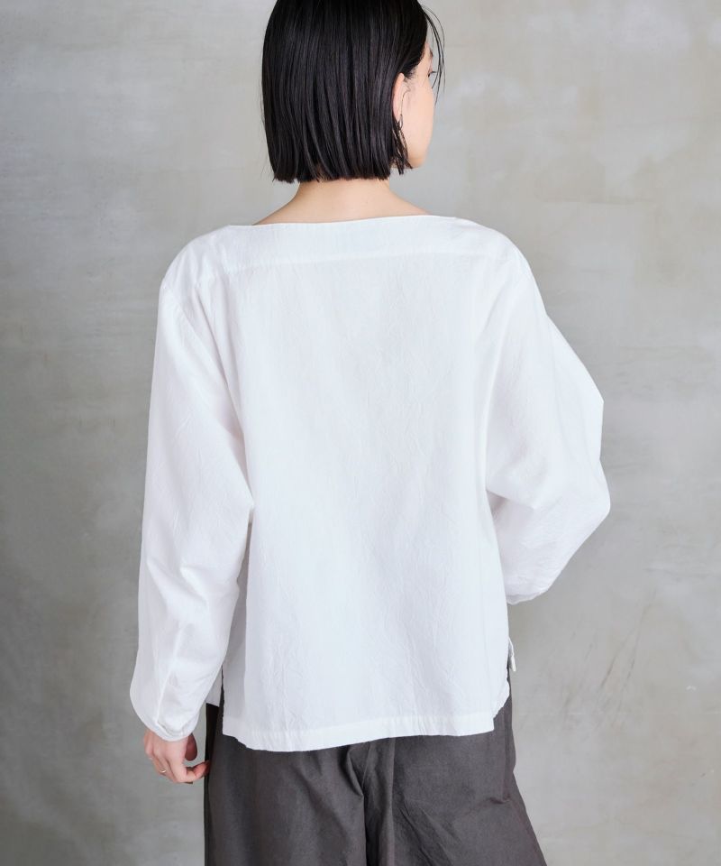 ボートネックタイプのスモック風シャツ。